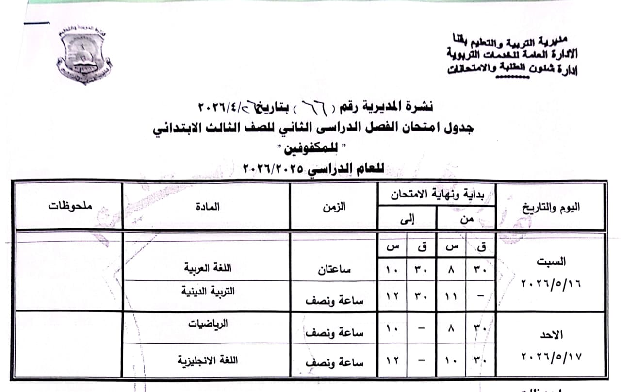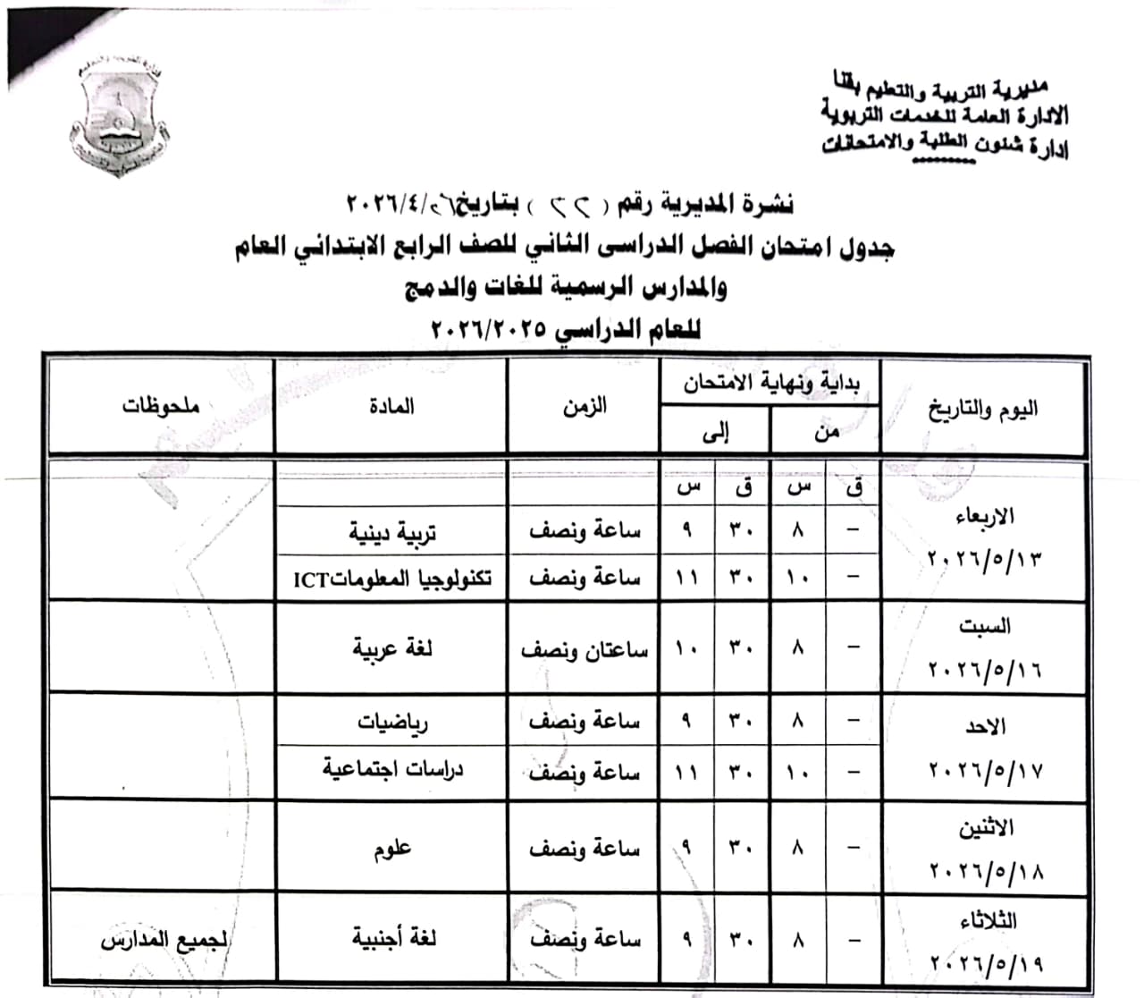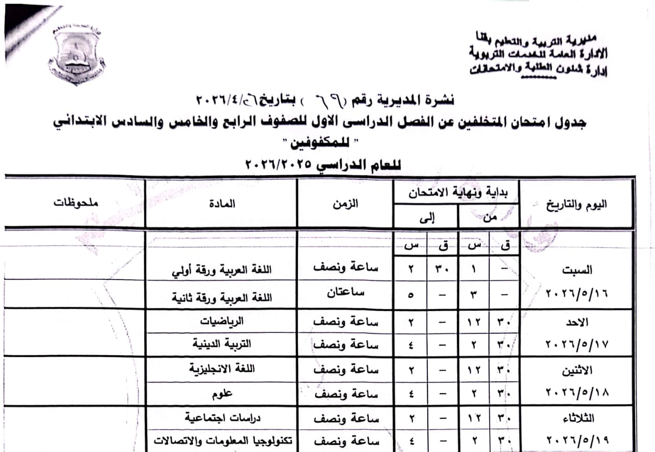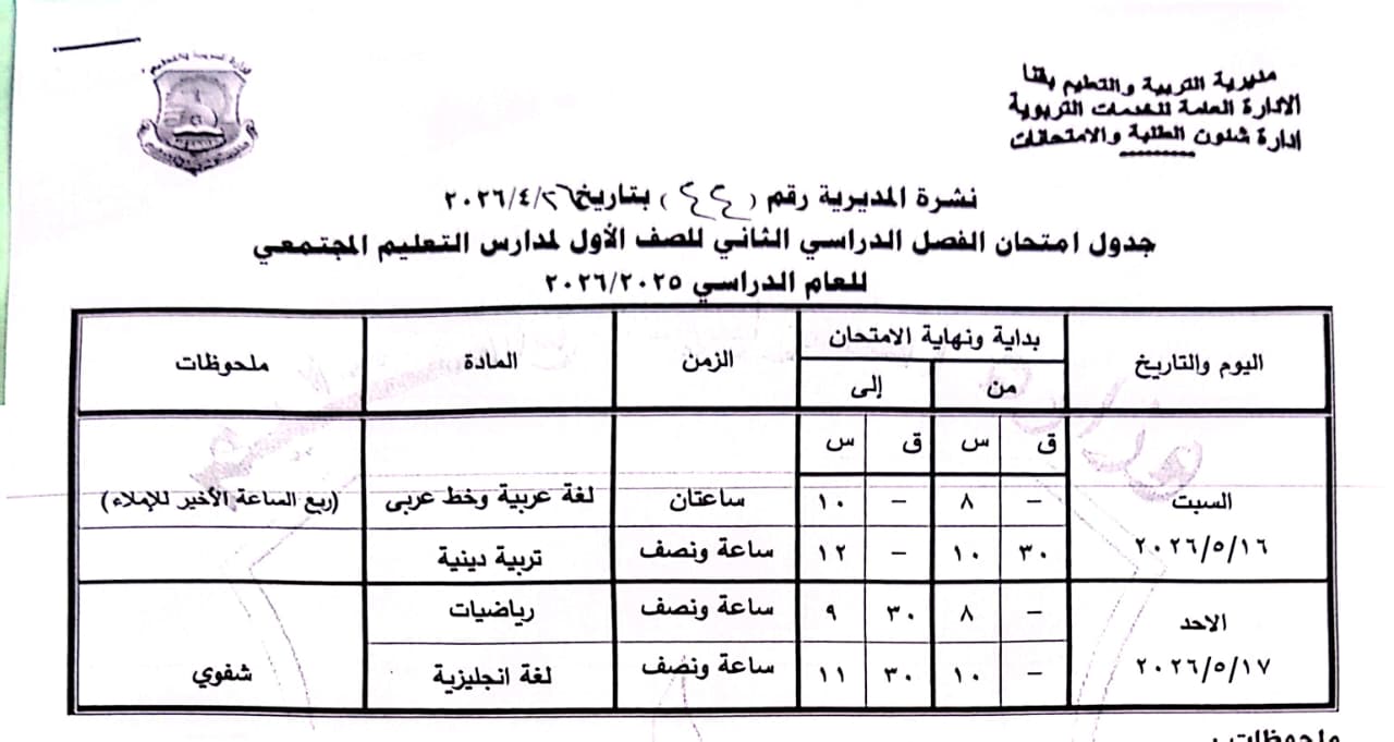 الصف الرابع الابتدائي: من السبت 16 مايو وحتى الثلاثاء 19 مايو 2026.