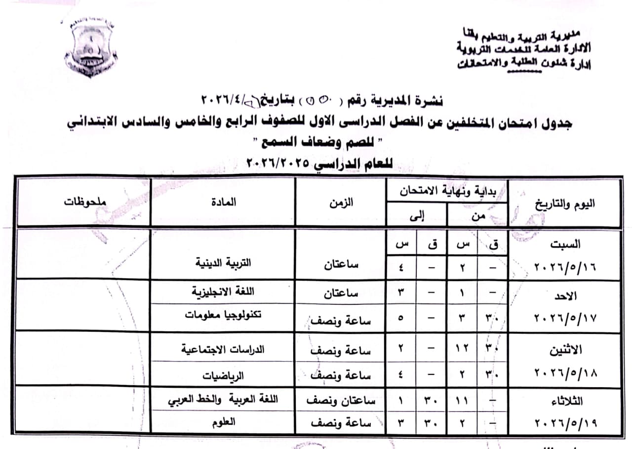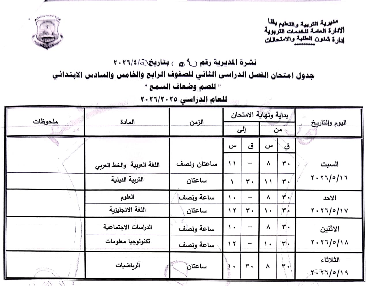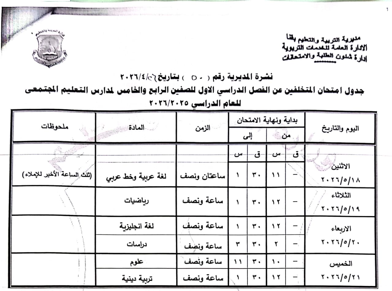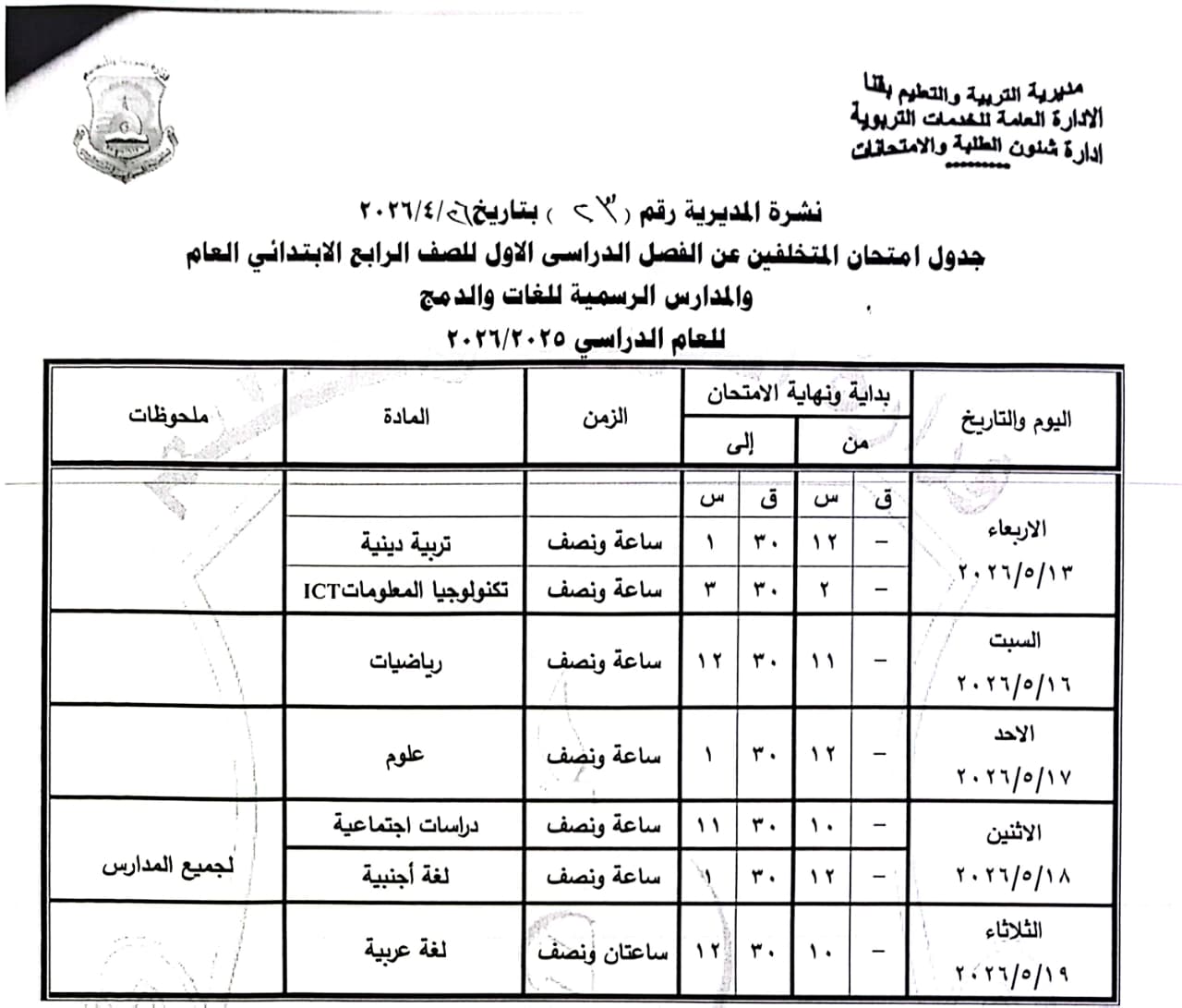 الصف الرابع الابتدائي: من السبت 16 مايو وحتى الثلاثاء 19 مايو 2026.