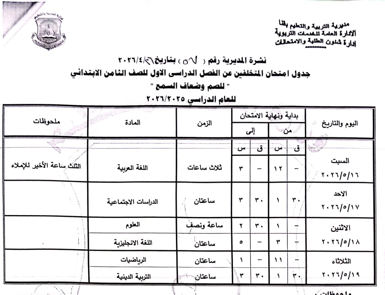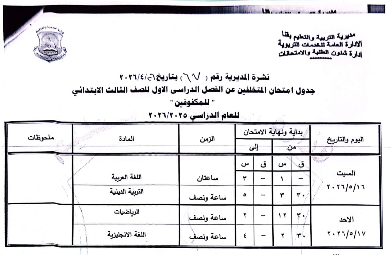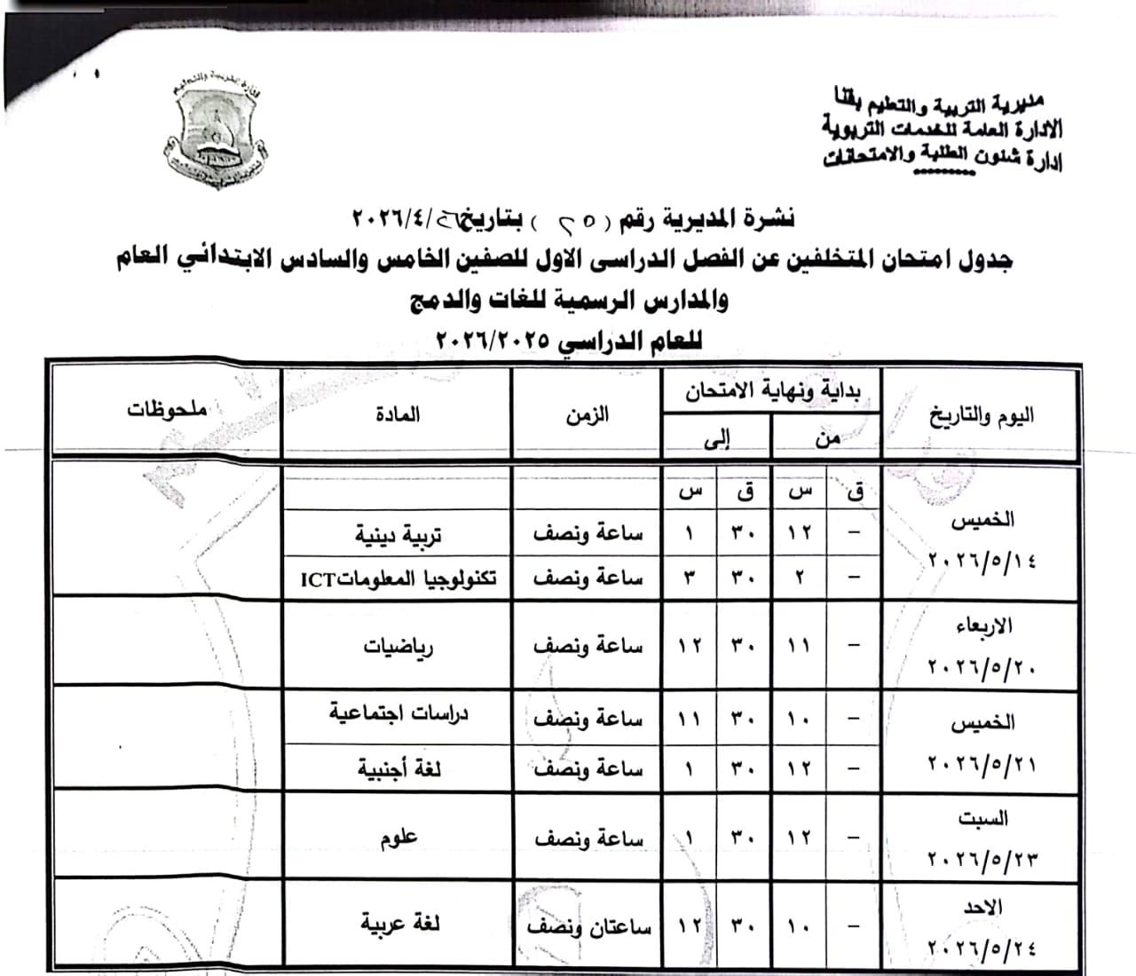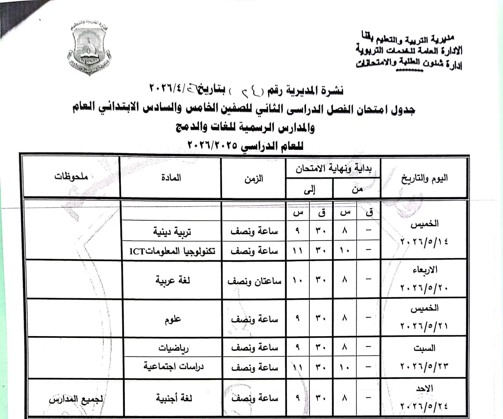 الصف الرابع الابتدائي: من السبت 16 مايو وحتى الثلاثاء 19 مايو 2026.