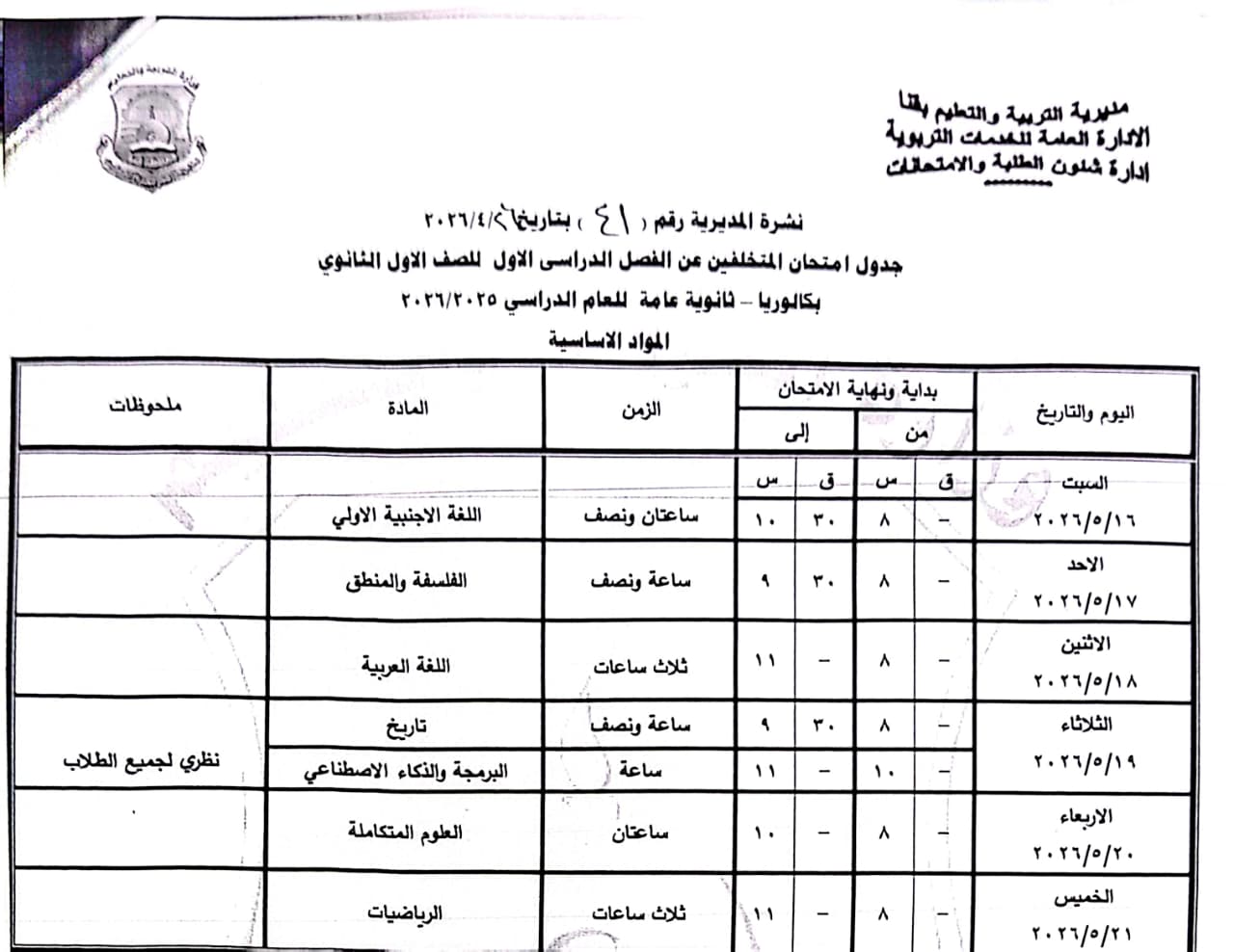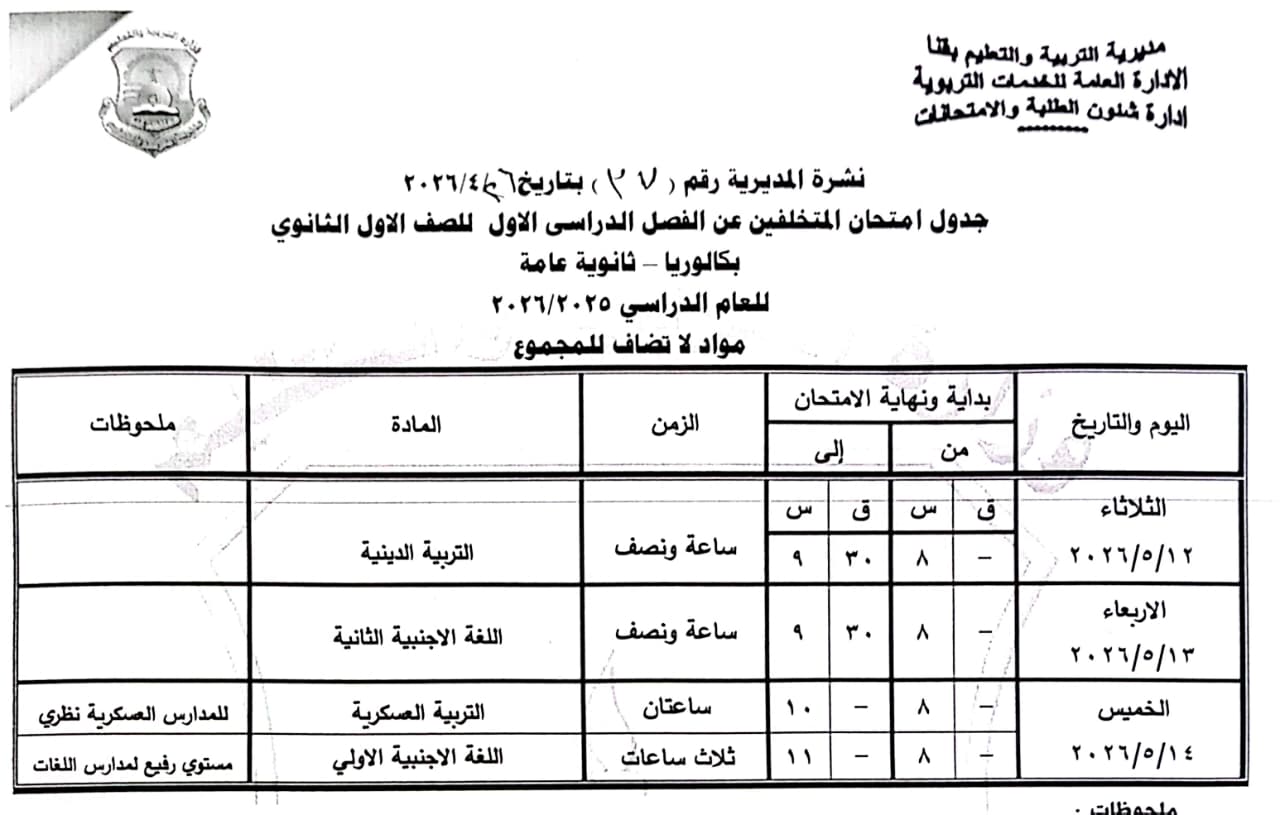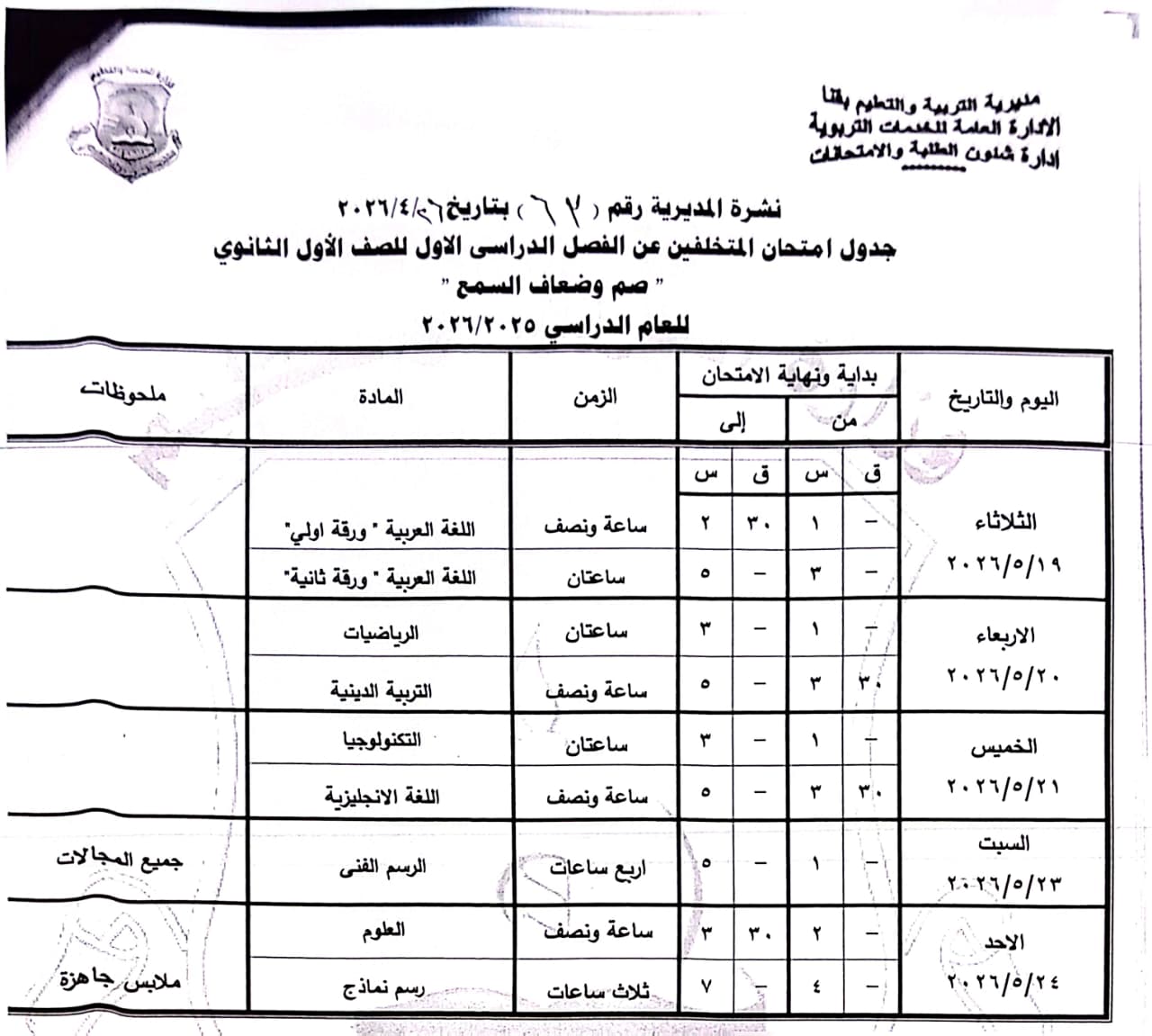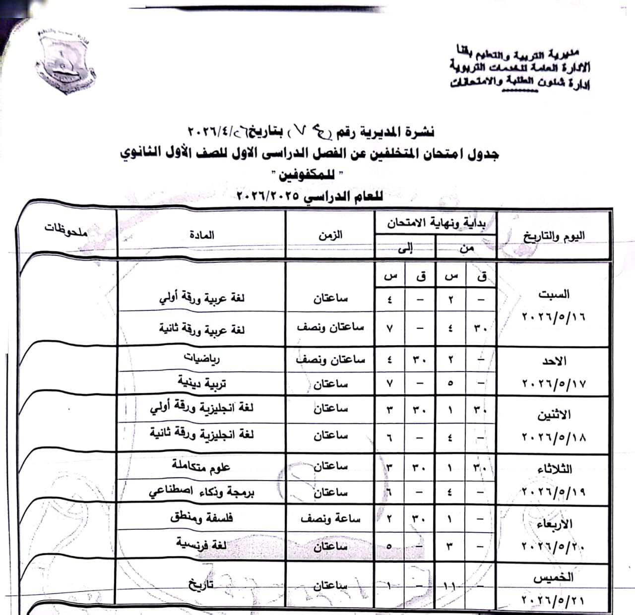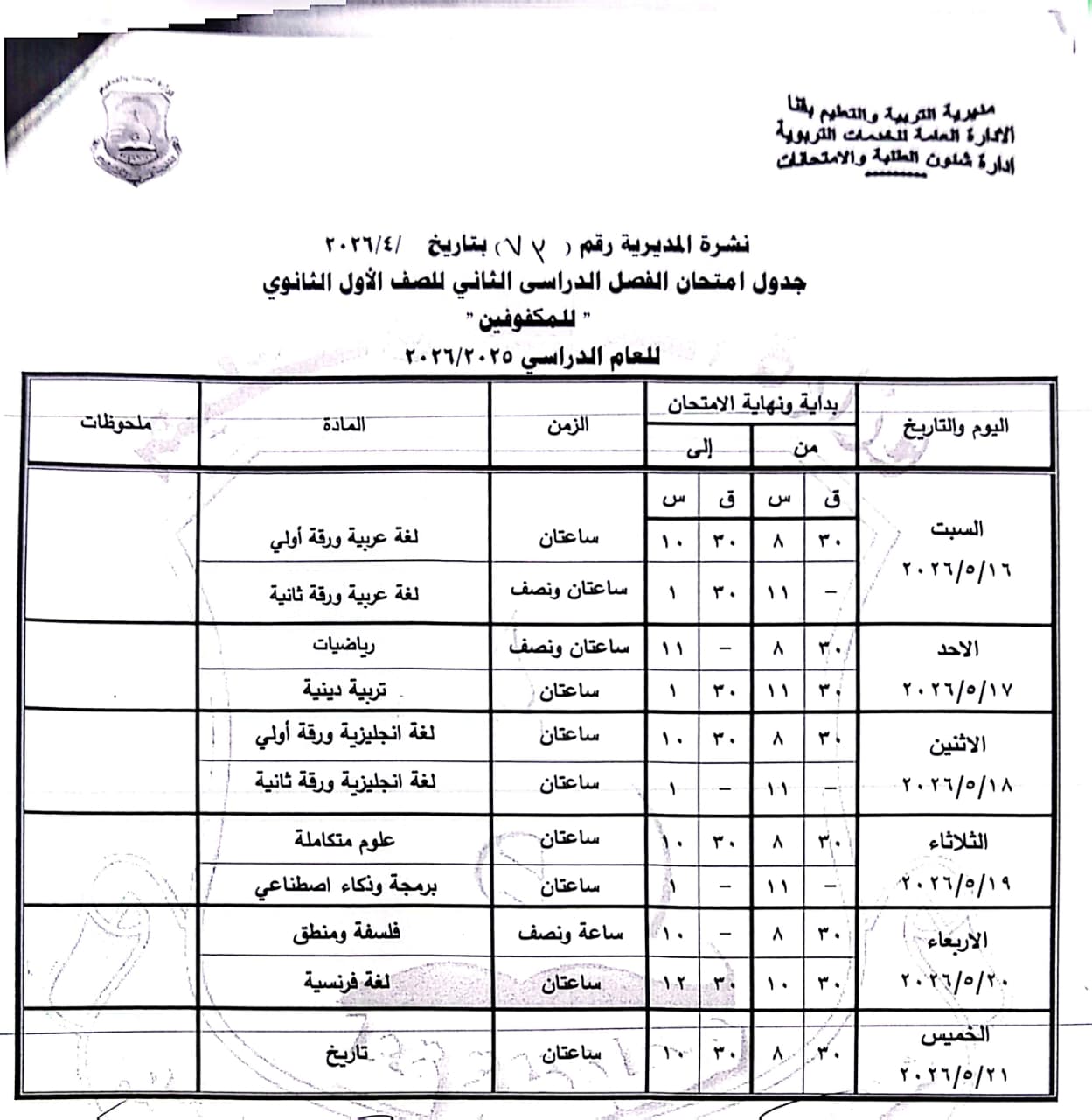 الصف الأول الثانوي: من السبت 16 مايو وحتى الخميس 21 مايو 2026.