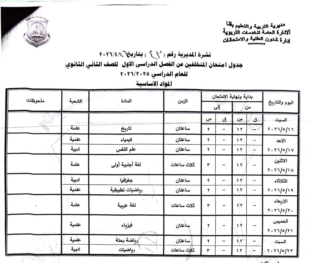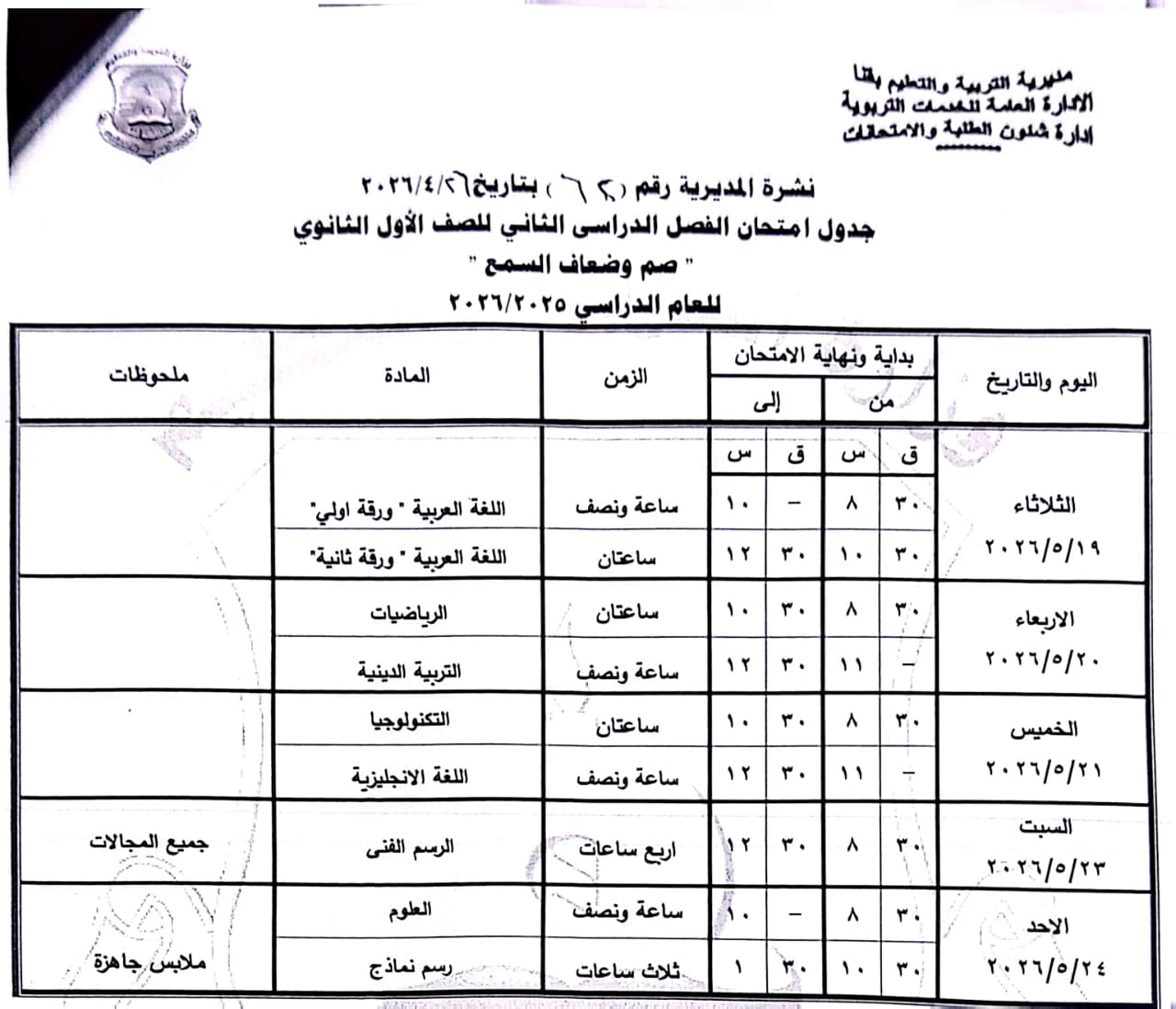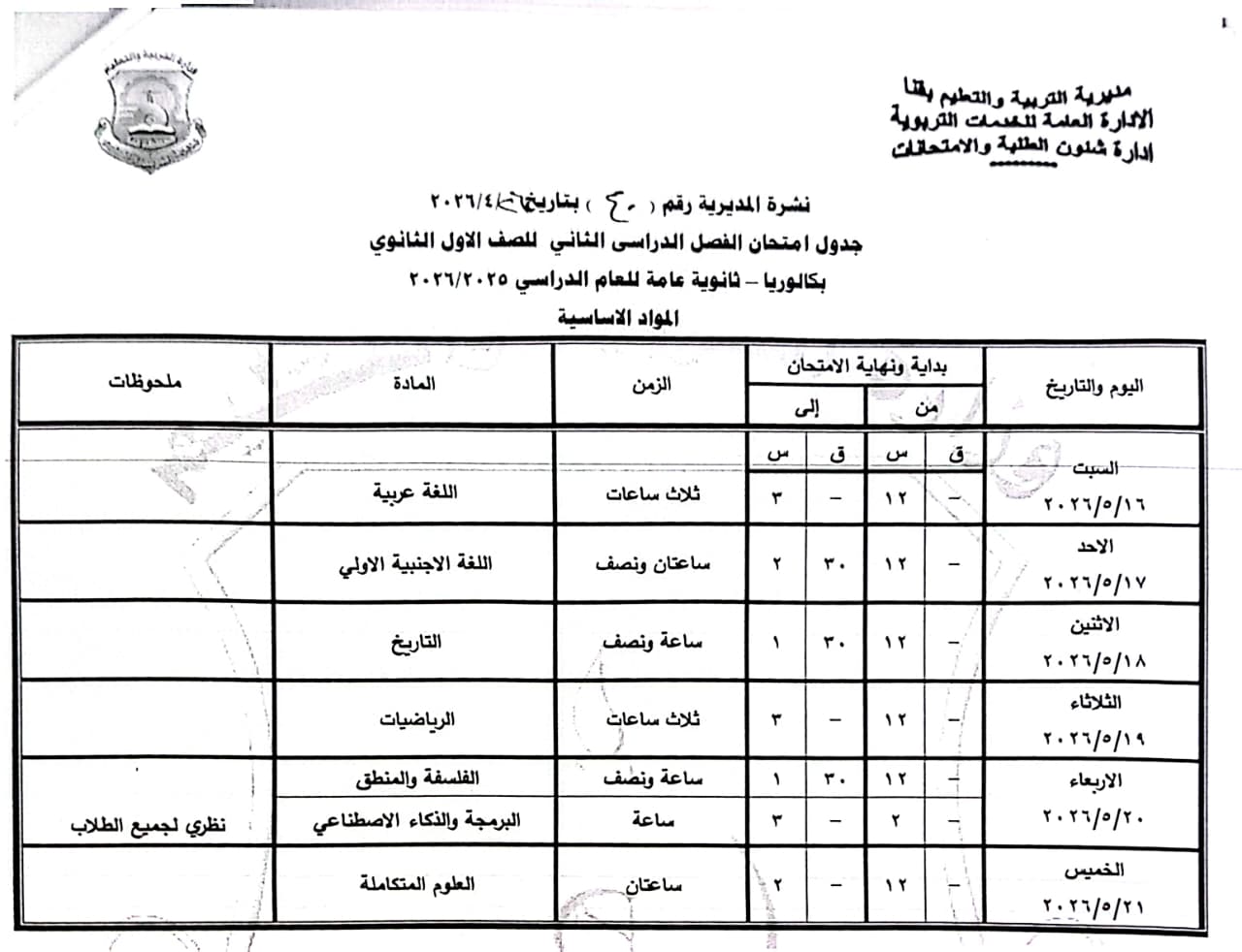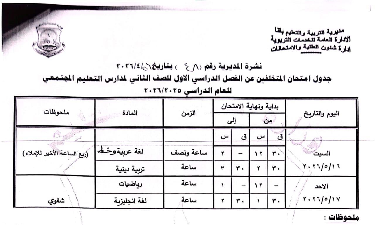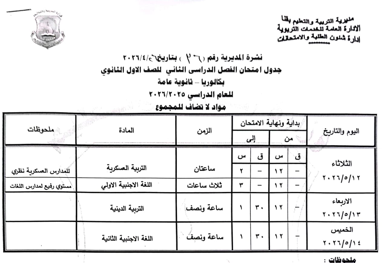 الصف الثاني الثانوي: من السبت 16 مايو وحتى السبت 23 مايو 2026.
