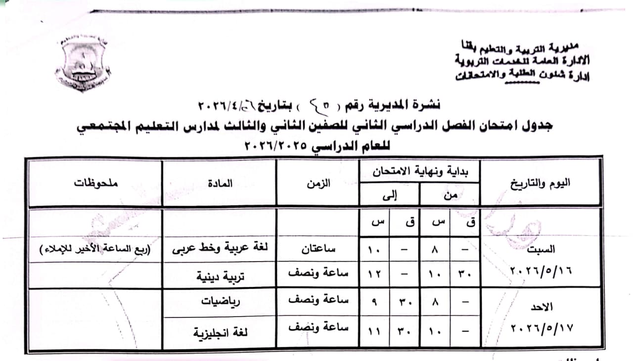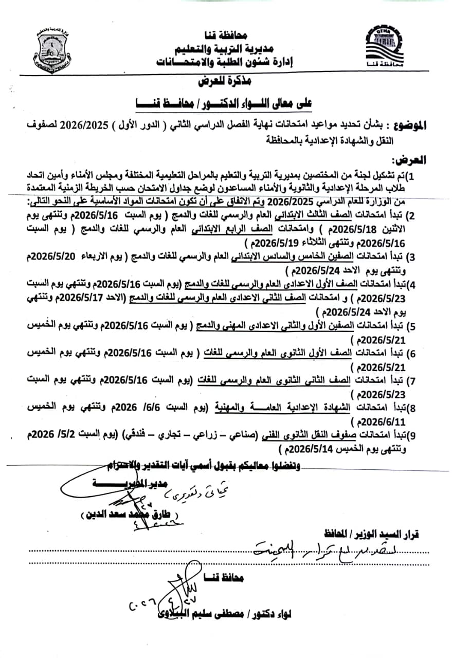اعتمد اللواء دكتور مصطفى الببلاوي، محافظ قنا، جداول امتحانات الفصل الدراسي الثاني للعام الدراسي 2025 / 2026م، لمختلف المراحل التعليمية “النقل والشهادات العامة” على مستوى جميع الإدارات التعليمية بالمحافظة.