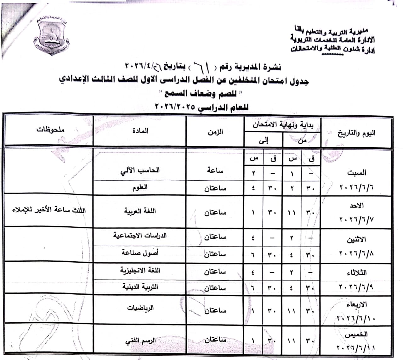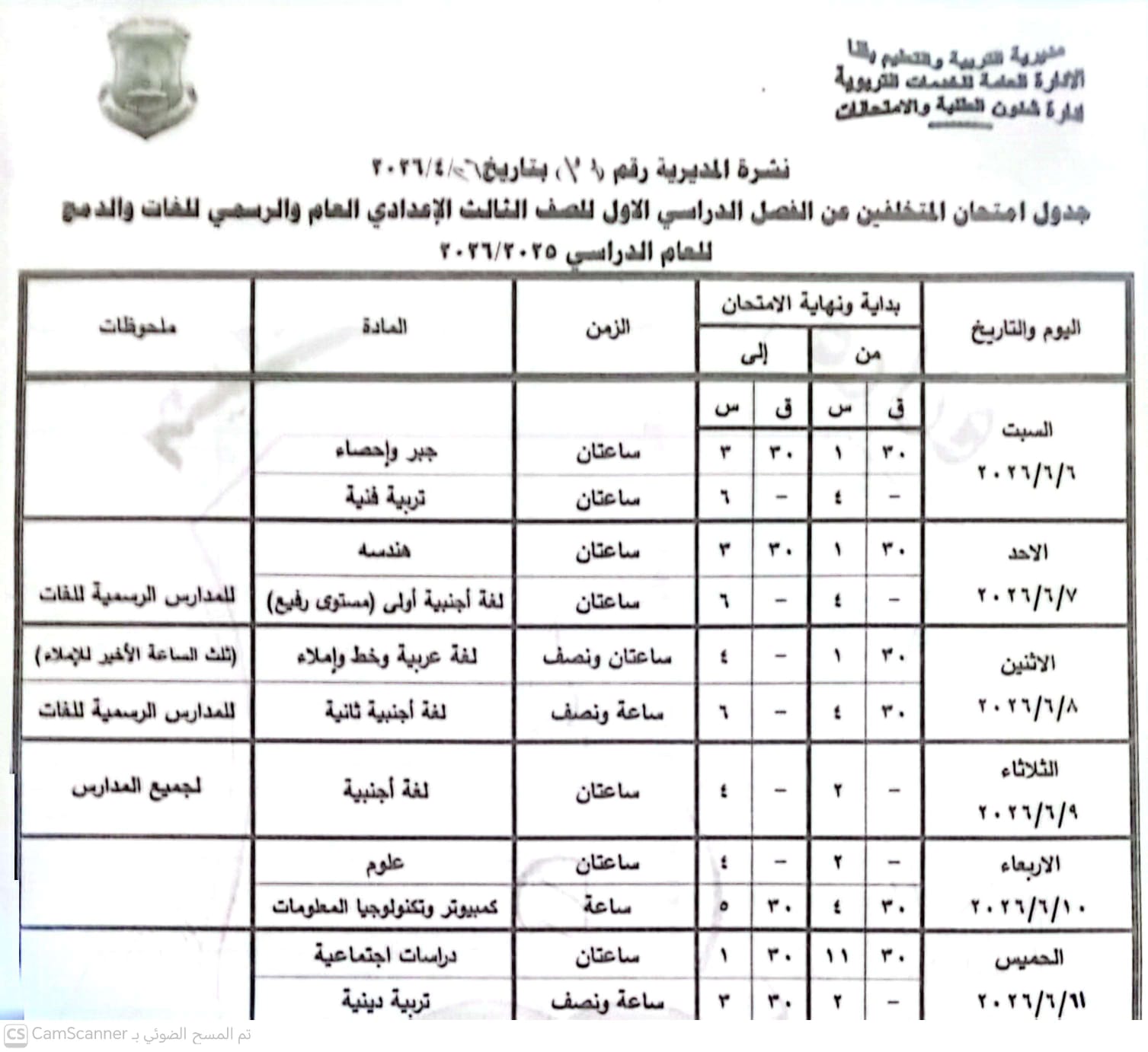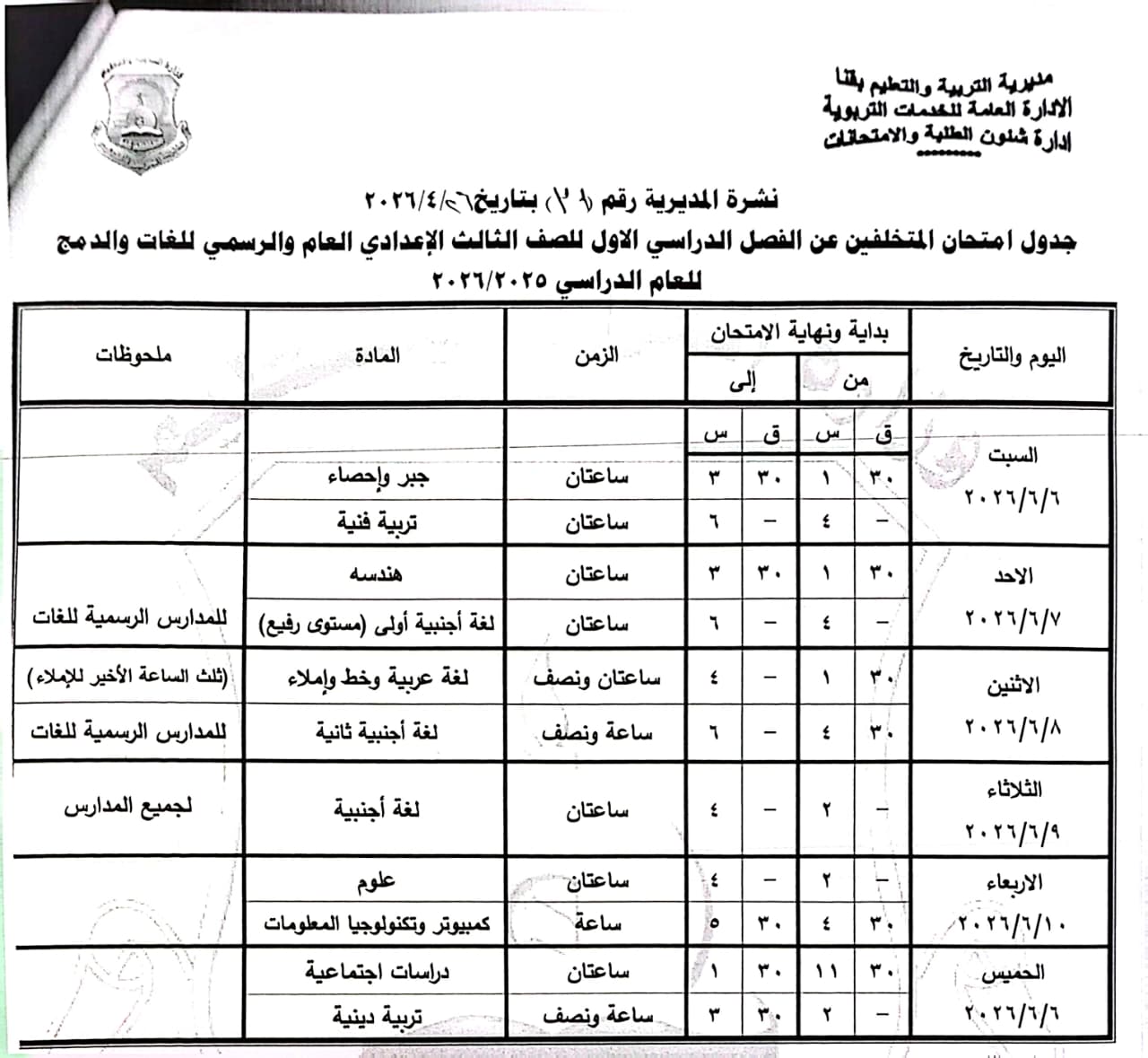 الشهادة الإعدادية (عامة ومهنية): تبدأ من السبت 6 يونيو وحتى الخميس 11 يونيو 2026.