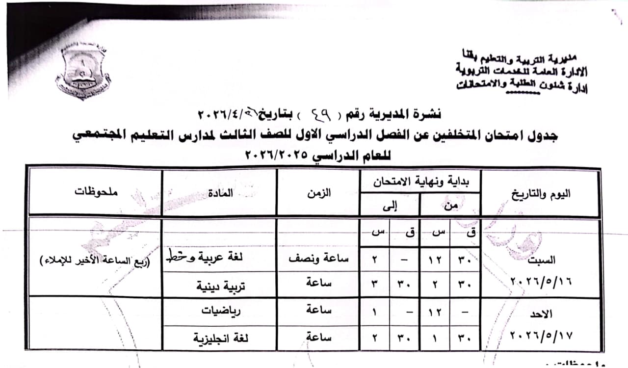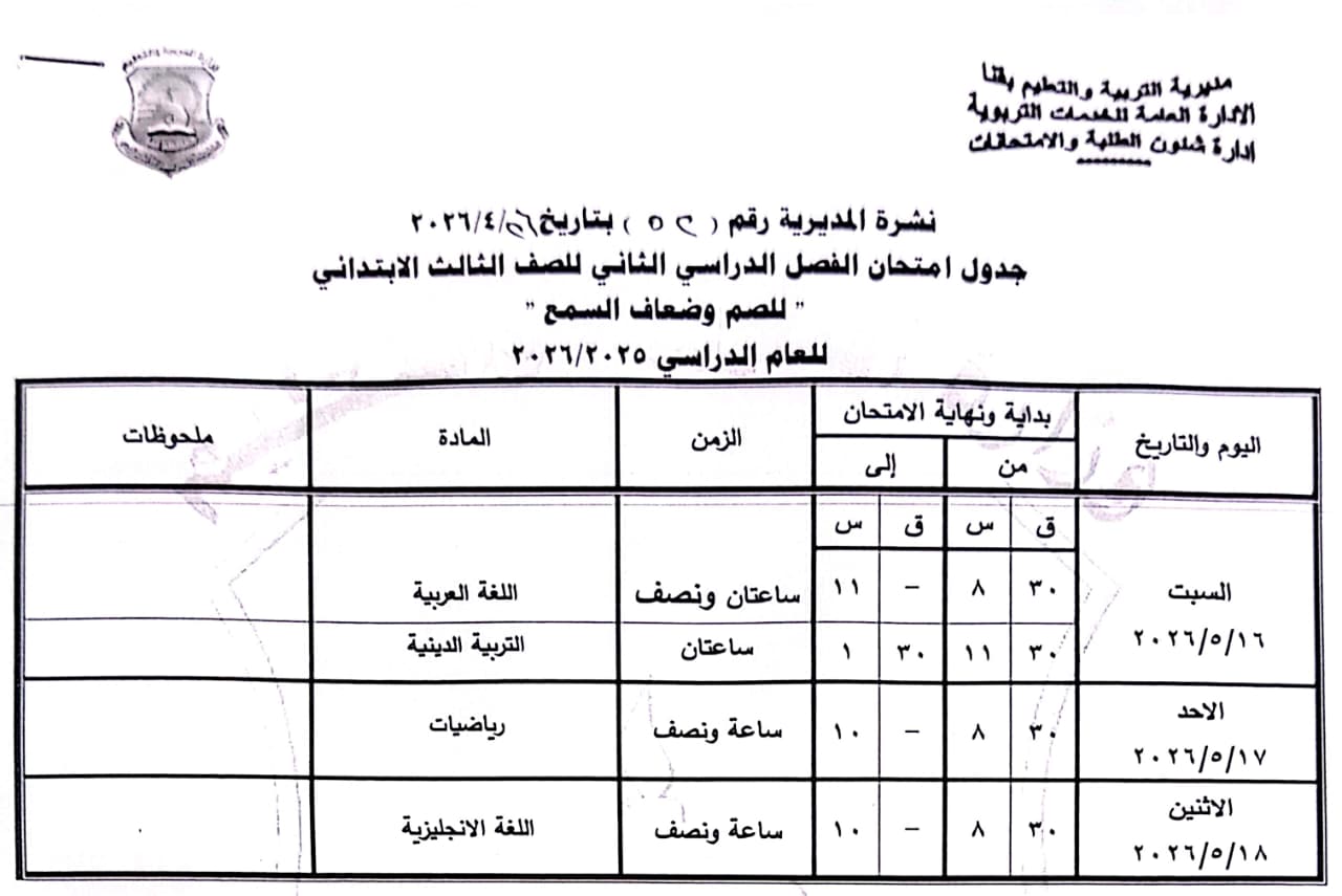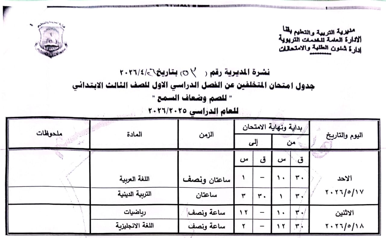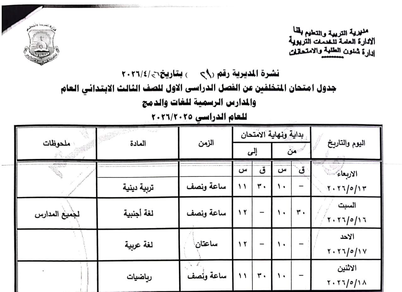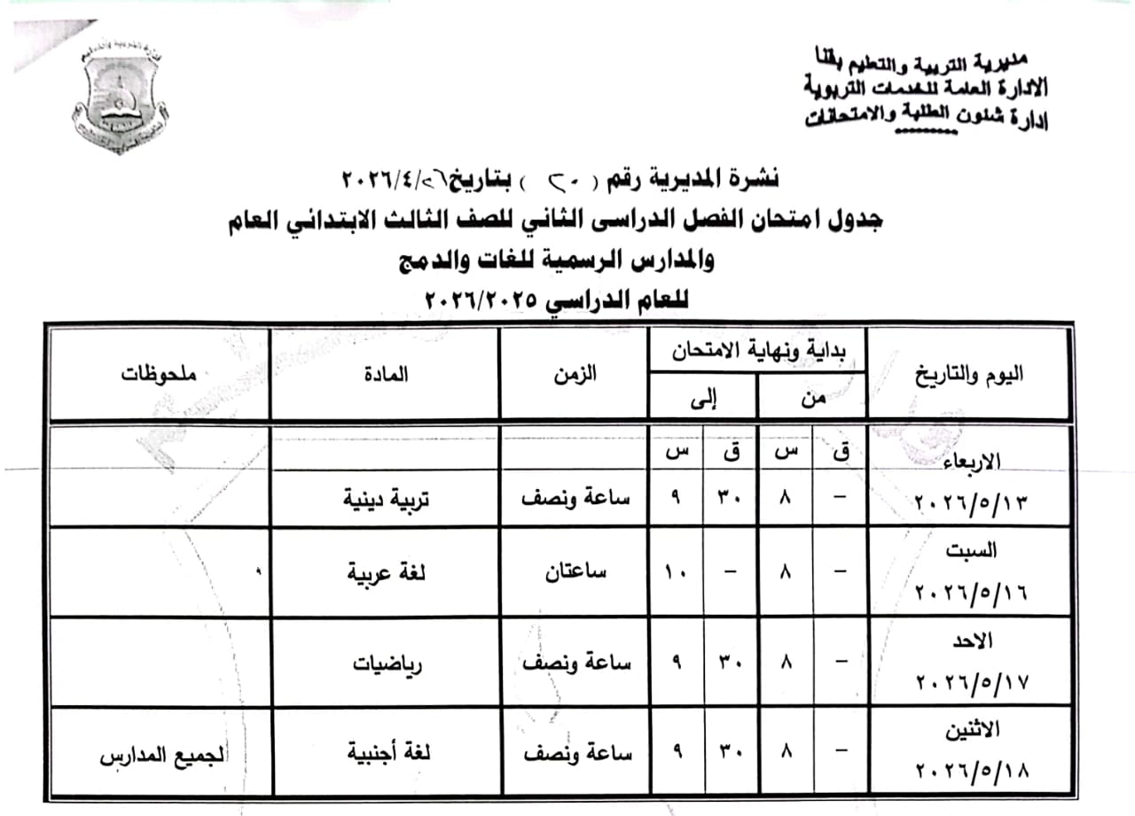 أولاً: المرحلة الابتدائية “عام - لغات - دمج”، الصف الثالث الابتدائي: من السبت 16 مايو وحتى الاثنين 18 مايو 2026.