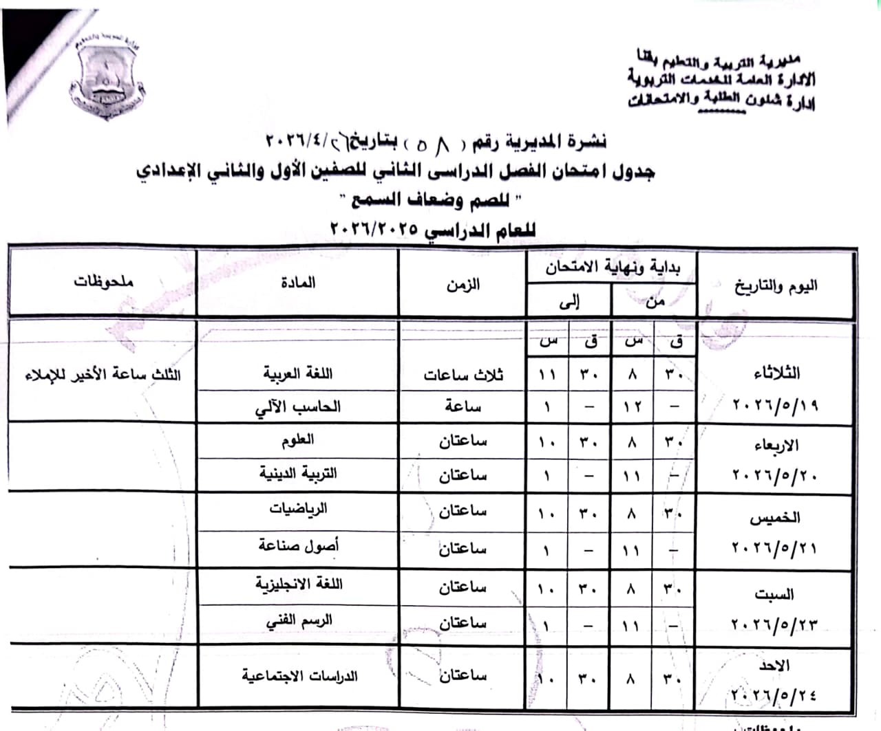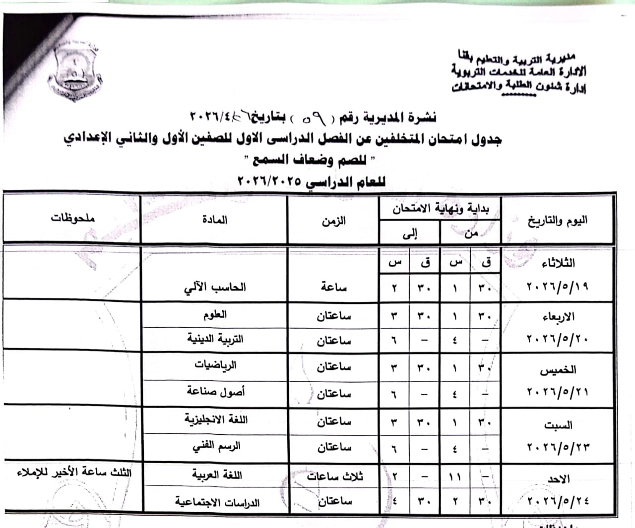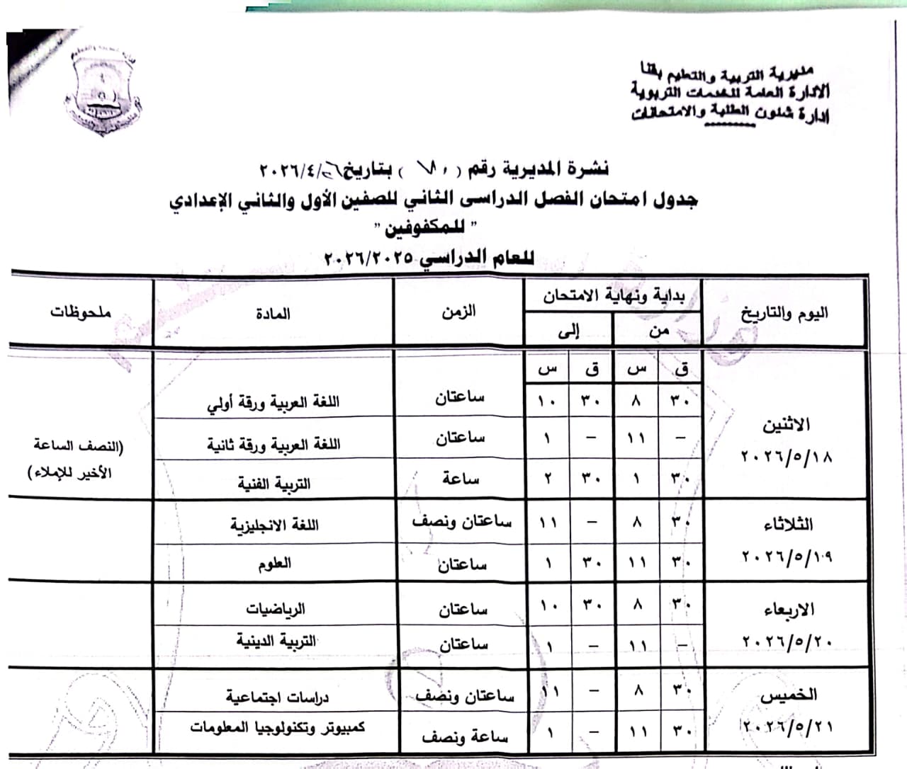 الصفين الأول والثاني الإعدادي (مهني): من السبت 16 مايو وحتى الخميس 21 مايو 2026.