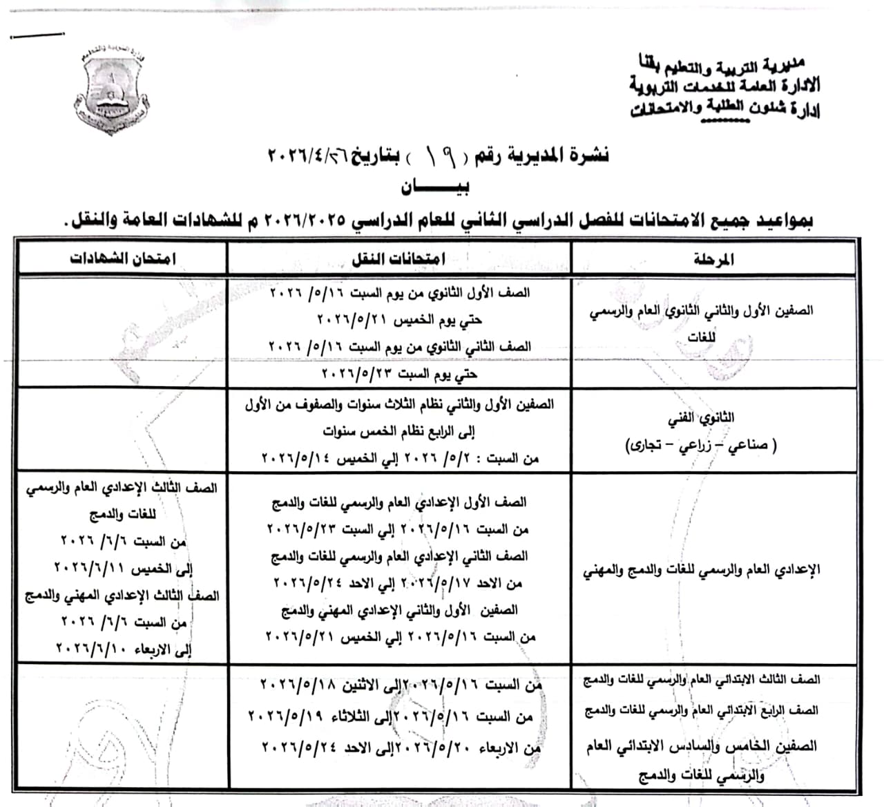 التعليم الثانوي الفني (بجميع تخصصاته): تبدأ امتحانات النقل من السبت 2 مايو وحتى الخميس 14 مايو 2026.