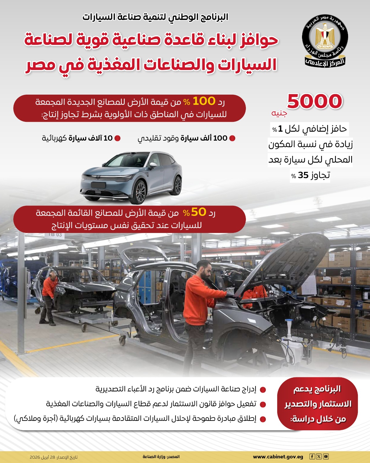 نشر المركز الإعلامي لمجلس الوزراء، إنفوجرافًا عبر منصاته الرسمية على مواقع التواصل الاجتماعي، سلط من خلاله الضوء على الحوافز المقدمة لبناء قاعدة قوية لصناعة السيارات والصناعات المغذية لها في مصر، وذلك في إطار البرنامج الوطني لتنمية صناعة السيارات.