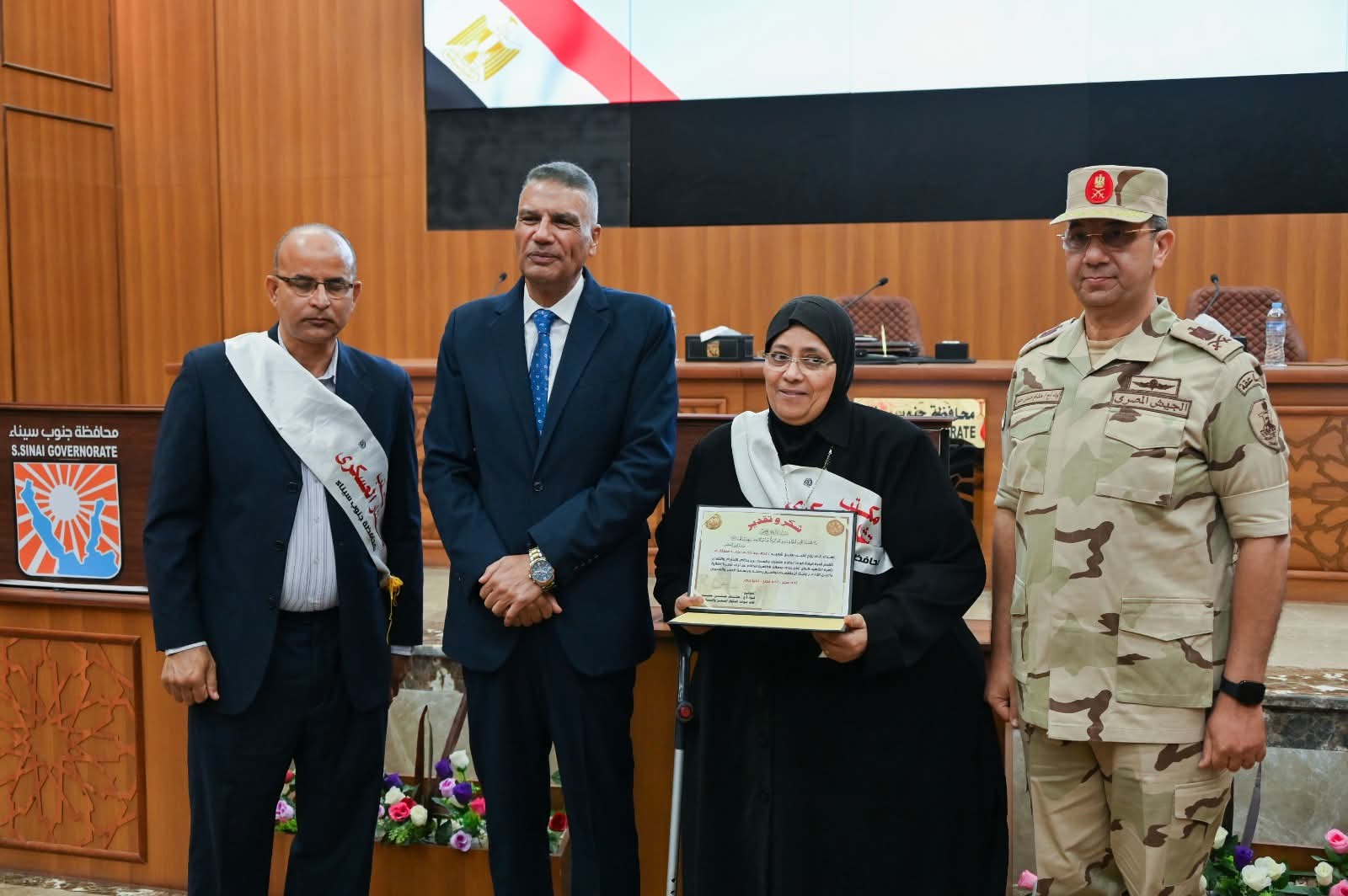 النقيب وائل إبراهيم المر، والنقيب محمود ناجي العواد؛ حيث تم تسليم دروع التكريم لأسرتيهما تقديرًا لتضحياتهما في سبيل الوطن، كما تبادل محافظ جنوب سيناء وقائد قوات الدفاع الشعبي والعسكري الدروع