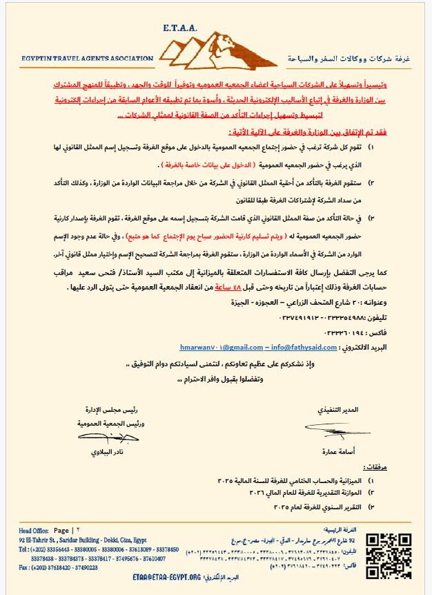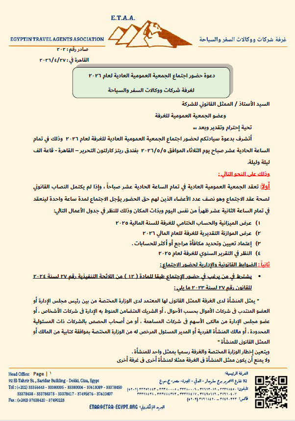 تعقد غرفة شركات ووكالات السفر والسياحة جمعيتها العمومية العادية لعام 2026 يوم الثلاثاء القادم الموافق الخامس من مايو ، يتضمن جدول أعمال الجمعية عرض الميزانية والحساب الختامي للغرفة للسنة المالية 2025 وعرض الموازنة التقديرية للعام المالي 2026 ، النظر في التقرير السنوي للغرفة لعام 2025