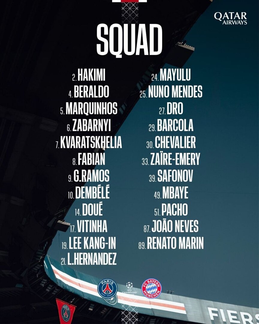 أعلن لويس أنريكي المدير الفني لفريق باريس سان جيرمان قائمته لمواجهة بايرن ميونخ على ملعب حديقة الأمراء في ذهاب نصف نهائي دوري أبطال أوروبا لموسم 2025-2026 .