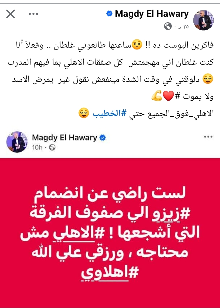 وقال مجدي الهواري عبر حسابه علي فيسبوك" إنه سبق وانتقد التعاقد مع اللاعب أحمد سيد زيزو، مشيرًا إلى أنه تعرض لهجوم حينها، مضيفًا: «كنت غلطان إني ما هاجمتش كل صفقات الأهلي بما فيهم المدرب»، في إشارة إلى سلسلة التغييرات داخل الفريق خلال الفترة الأخيرة.