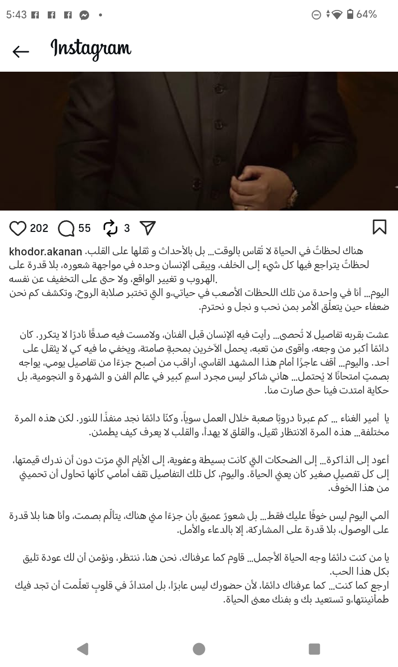 وكتب وكيل أعماله عبر صفحته على موقع التواصل الاجتماعي إنستجرام:"هناك لحظات في الحياة لا تقاس بالوقت... بل بالأحداث و ثقلها على القلب. لحظات يتراجع فيها كل شيء إلى الخلف، ويبقى الإنسان وحده في مواجهة شعوره، بلا قدرة على الهروب و تغيير الواقع، ولا حتى على التخفيف عن نفسه"