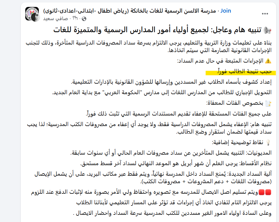 أعلنت المدارس أنه قد تقرر رسمياً حجب نتيجة الطلاب غير المسددين للمصروفات الدراسية المتأخرة