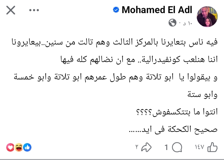 وأضاف العدل عبر حسابه على فيسبوك، أن من يوجهون الانتقادات للأهلي حول “المركز الثالث” أو “أبو تلاتة” هم في الأساس اعتادوا التواجد في مراكز متأخرة مثل الثالث والخامس والسادس عبر سنوات طويلة.