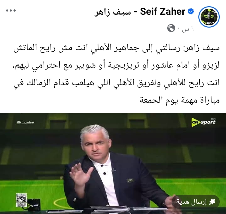 وجّه الإعلامي سيف زاهر رسالة إلى جماهير الأهلي قبل مواجهة الزمالك المرتقبة، مؤكدًا أن دعم المدرجات يجب أن يكون من أجل النادي وليس من أجل أسماء اللاعبين، مهما كانت قيمتهم أو شعبيتهم داخل الفريق.