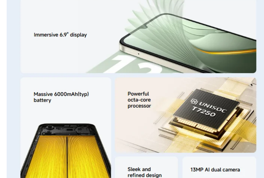يعتمد الهاتف على معالج Unisoc T7250، وهو مناسب تمامًا للمهام الأساسية مثل المراسلة، ومشاهدة الفيديوهات، والألعاب الخفيفة. سيكون الأداء مألوفًا لمن سبق له استخدام معالجات اقتصادية قديمة مثل Snapdragon 680 أو Helio G85. تقتصر الذاكرة على 4 جيجابايت من ذاكرة الوصول العشوائي (RAM)، بينما تصل سعة التخزين إلى 256 جيجابايت. كما يدعم الهاتف إضافة بطاقة microSD.