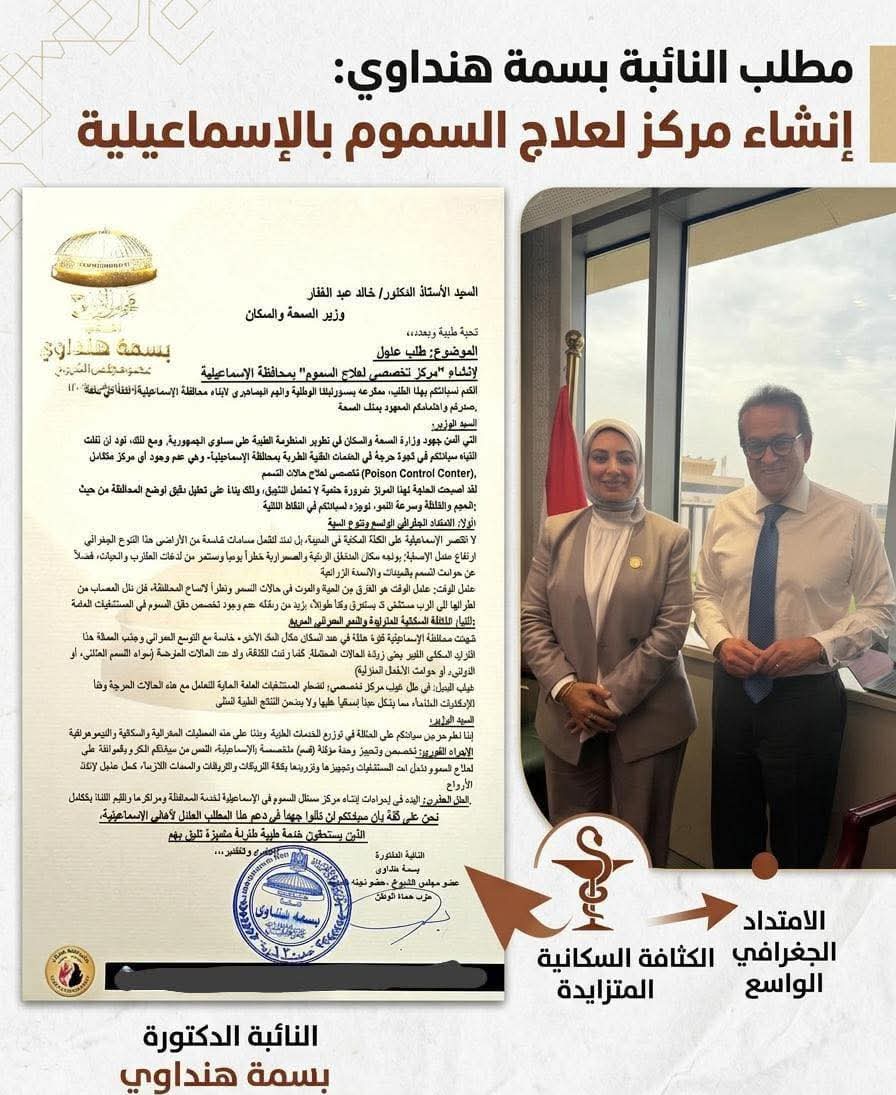 تقدمت النائبة بسمة هنداوي عضو مجلس الشيوخ في تحرك سريع يعكس إدراكًا حقيقيًا لخطورة الوضع الصحي وحرصًا على حماية أرواح المواطنين، بطلب برغبة عاجل إلى وزير الصحة، تطالب فيه بضرورة تخصيص جناح أو وحدة مؤقتة داخل أحد مستشفيات محافظة الإسماعيلية، ليكون مركزًا متخصصًا في علاج حالات التسمم.
