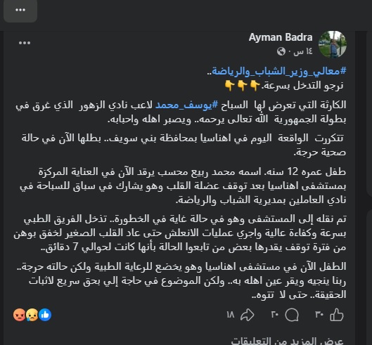 وتابع: “طفل عمره 12 سنة، اسمه محمد ربيع محسب يرقد الآن في العناية المركزة بمستشفى أهناسيا بعد توقف عضلة القلب وهو يشارك في سباق للسباحة في نادي العاملين بمديرية الشباب والرياضة”.