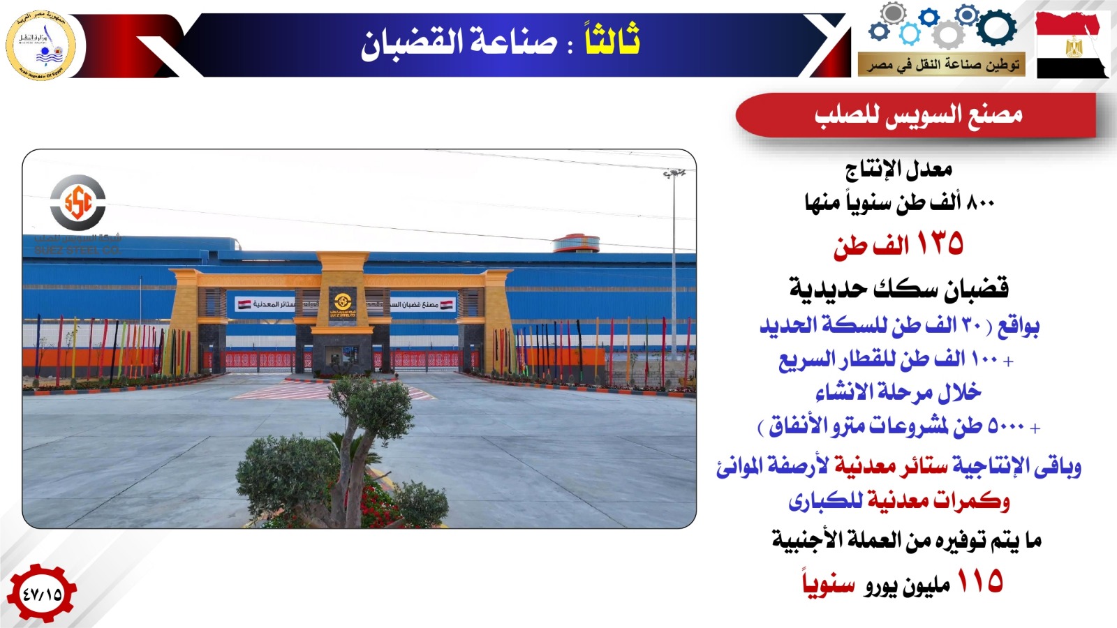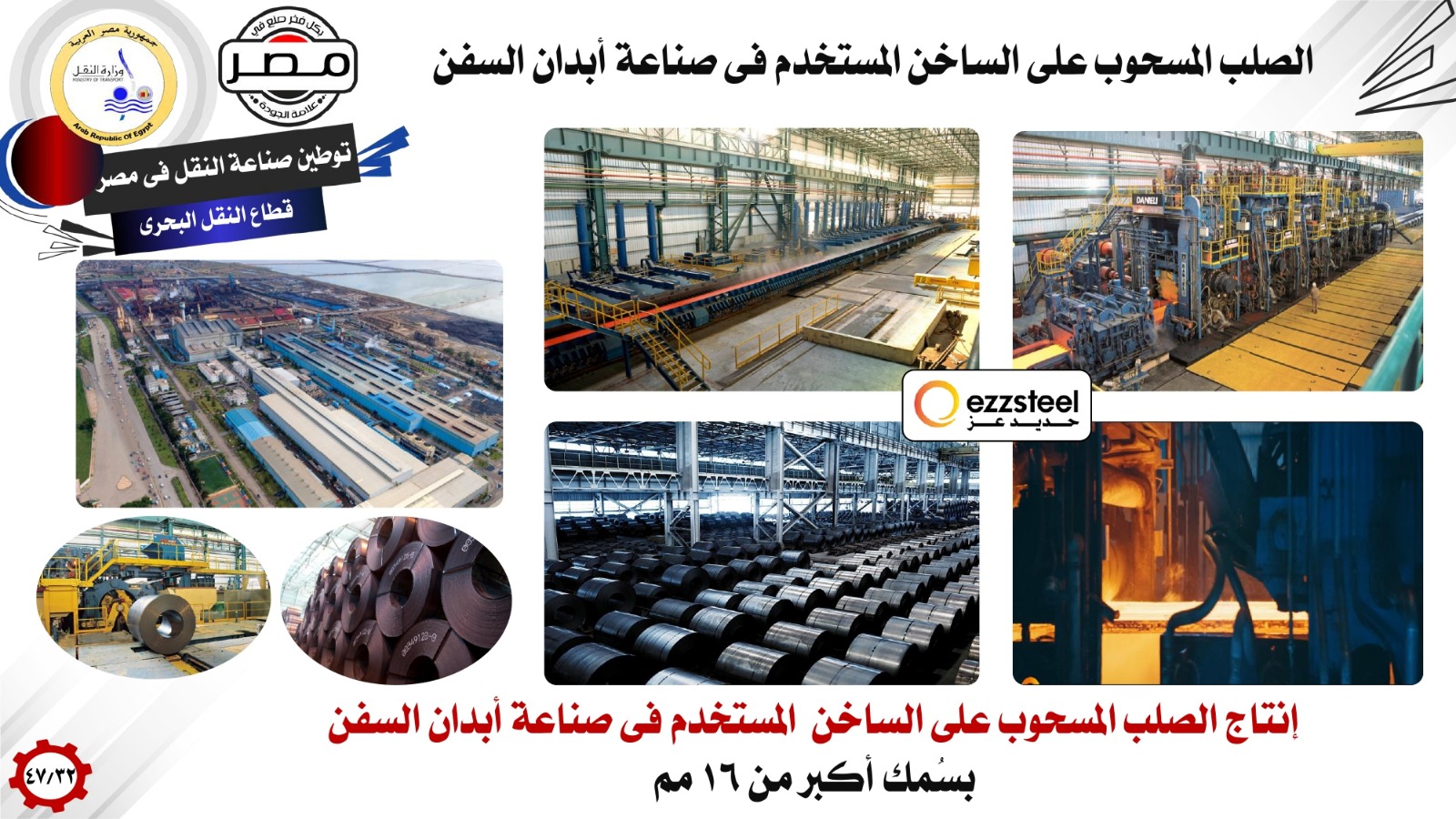 إلى جانب إنتاج الصلب المسحوب على الساخن المستخدم فى صناعة أبدان السفن بسُمك أكبر من 16 مم، في مصنع حديد عز وإنتاج مستلزمات أرصفة الموانئ البحرية (الفنادر – مدافع الرباط)، وإنتاج مواسير اللحام الحلزونى المستخدمة فى إنشاء ارصفة الموانىء البحرية ، بالإضافة إلى تصنيع البارجات النيلية لتعظيم الاستفادة من نقل البضائع الاستراتيجية بالوحدات النهرية لافتا الى تصنيع الوحدات النهرية ( الفنادق العائمة-الأتوبيس النهري -التاكسي النهري -لنشات نهرية ) بالشراكة مع ترسانات(هيئة قناة السويس-الشركة المصرية لإصلاح وبناء السفن-والمقاولون العرب ٠٠٠٠٠).
