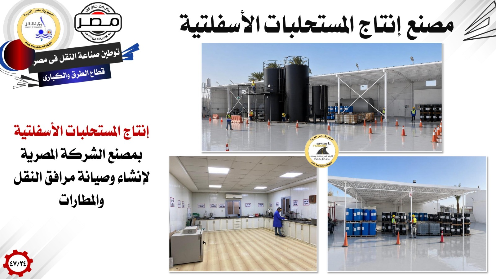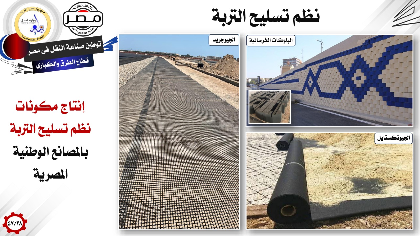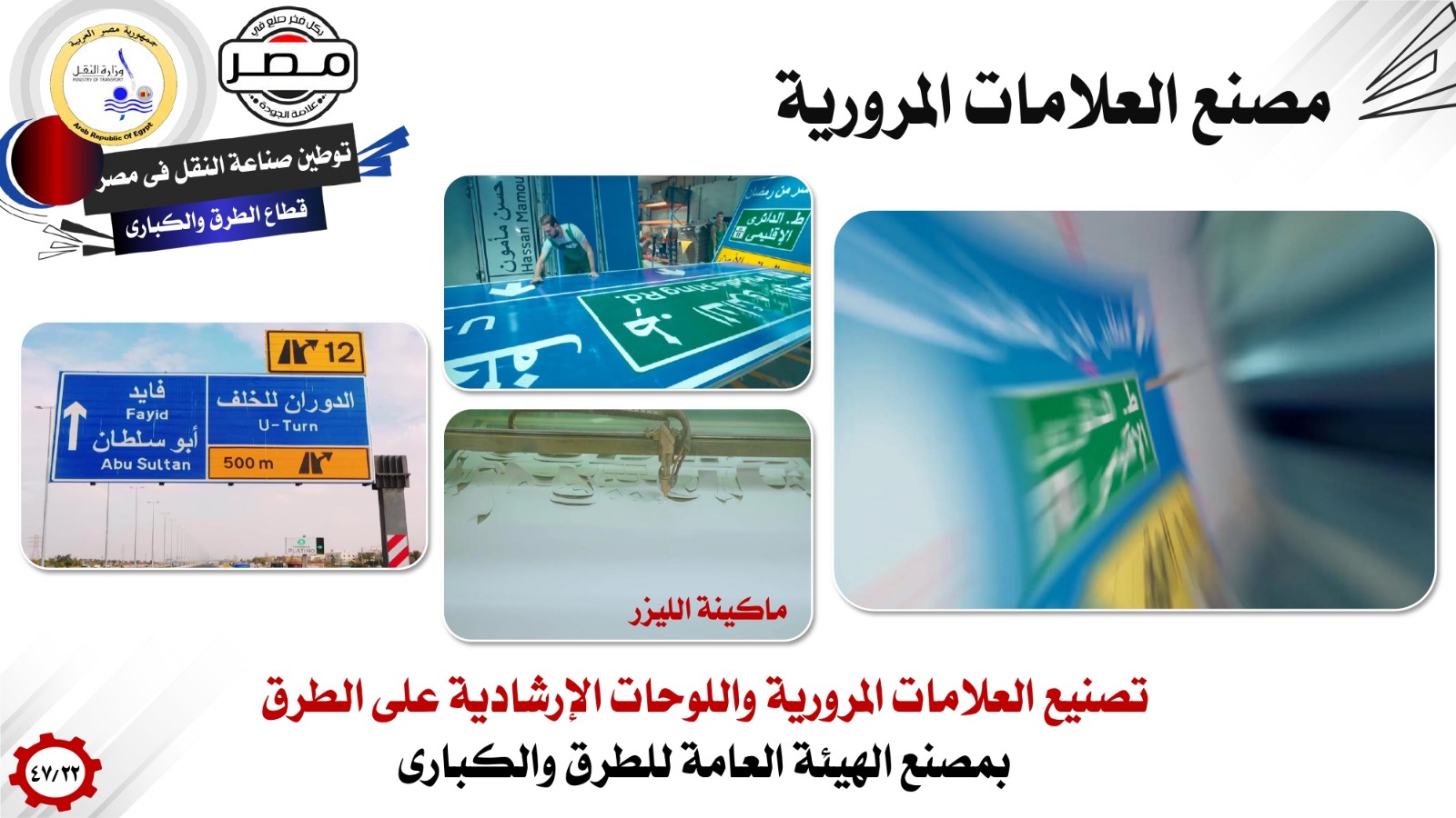 وفيما يتعلق بتوطين صناعات الطرق والكبارى، اشار وزير النقل إلى تصنيع العلامات المرورية واللوحات الإرشادية على الطرق بمصنع الهيئة العامة للطرق والكبارى، وإنتاج كافة البويات المرورية المستخدمة فى تخطيط الطرق والكبارى فى مصانع وطنية مصرية، وإنتاج المستحلبات الأسفلتية بمصنع الشركة المصرية لإنشاء وصيانة مرافق النقل والمطارات، بالإضافة إلى إنتاج كافة ركائز الكبارى وفواصل الكبارى وأنظمة العربات المتحركة لإنشاء الكبارى، وكذلك إنتاج مكونات نظم تسليح التربة، بالمصانع الوطنية المصرية.