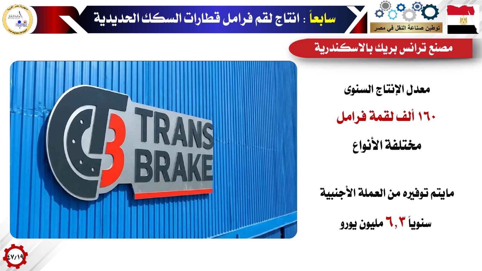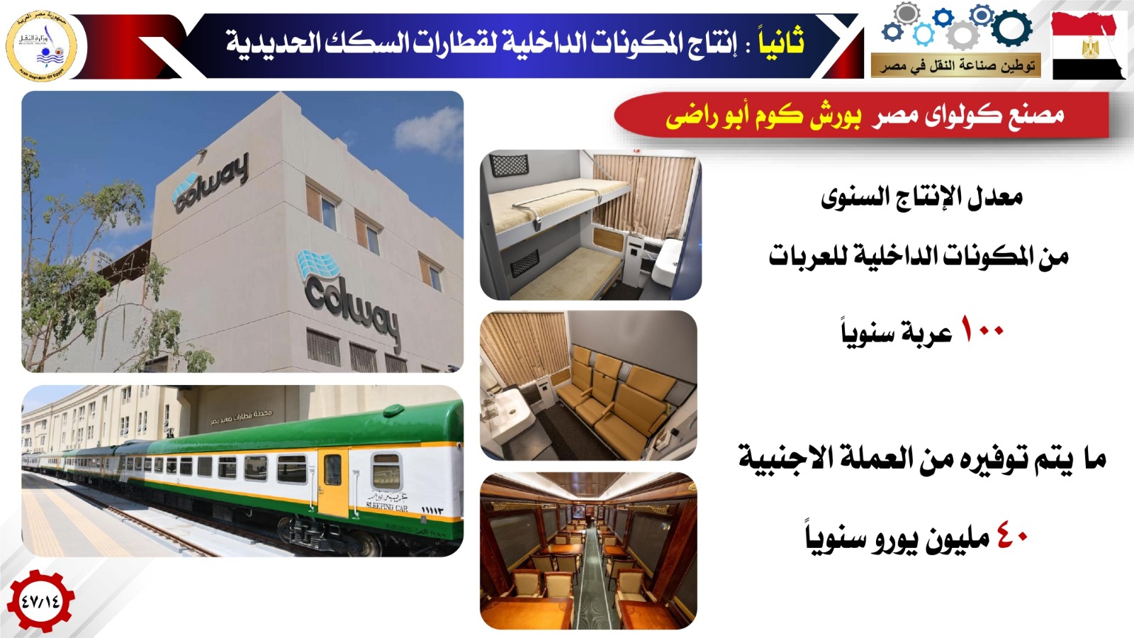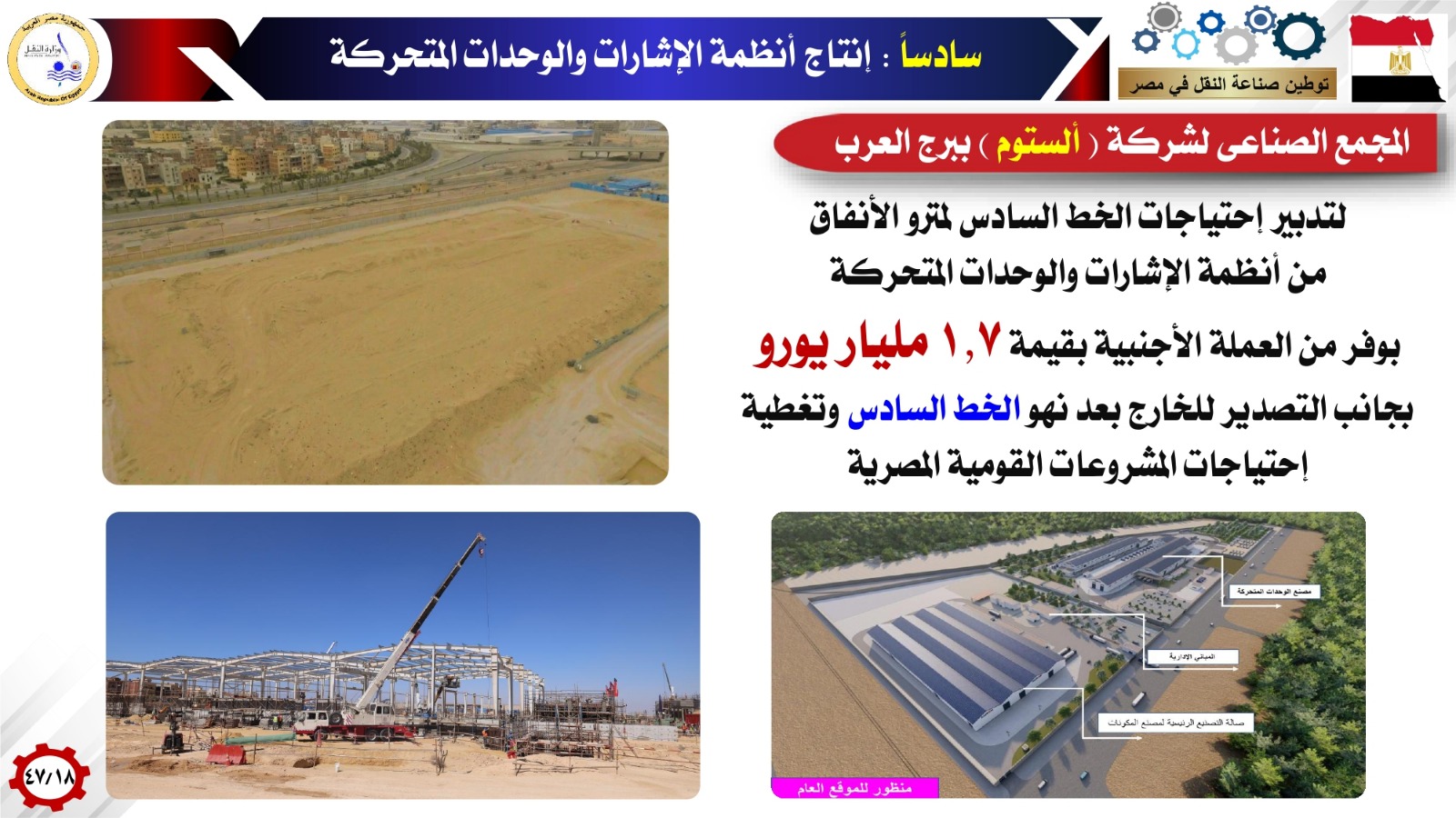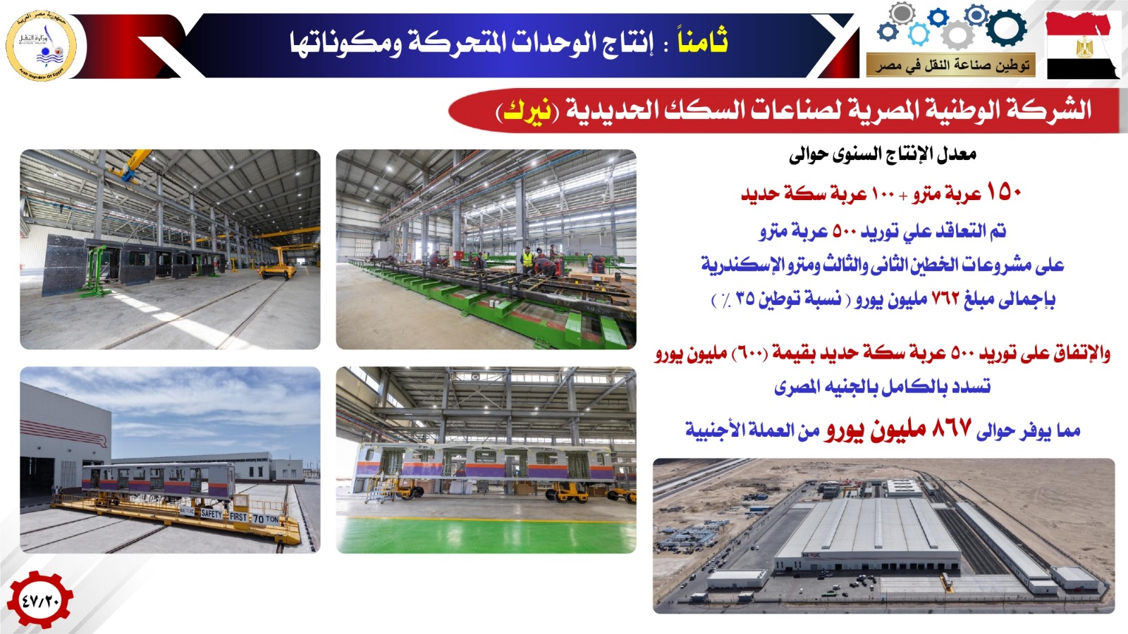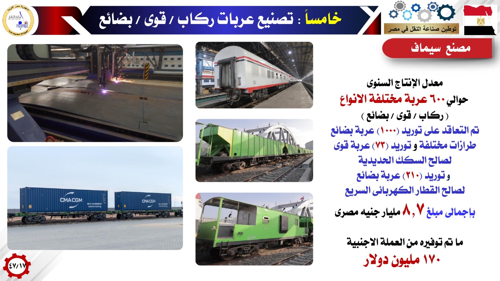 بالإضافة إلى تصنيع عربات ركاب / قوى / بضائع بمصنع سيماف بمعدل إنتاج سنوي حوالي 600 عربة مختلفة الأنواع، حيث تم التعاقد على توريد 1000 عربة بضائع طرازات مختلفة وتوريد 73 عربة قوى لصالح السكة الحديد وتوريد 210 عربة بضائع لصالح القطار الكهربائى السريع بإجمالى 8.7 مليار جنيه، وهو مايساهم في توفير 170 مليون دولار من العملة الأجنبية، إلى جانب إنشاء المجمع الصناعى لشركة ألستوم ببرج العرب لإنتاج أنظمة الإشارات والوحدات المتحركة لتدبير احتياجات الخط السادس لمترو الأنفاق بما يساهم في توفير 1.7 مليار يورو من العملة الأجنبية بجانب التصدير للخارج بعد نهو الخط السادس تغطية احتياجات المشروعات القومية المصرية. إضافة إلى إنتاج لقم فرامل قطارات السكك الحديدية بمصنع ترانس بريك بالإسكندرية بمعدل 160 ألف لقمة سنوياً وهو مايساهم في توفير 6.3 مليون يورو سنوياً، من العملة الأجنبية وإنتاج الوحدات المتحركة ومكوناتها من خلال الشركة الوطنية المصرية لصناعات السكك الحديدية (نيرك) بمعدل إنتاج سنوي حوالي ١٥٠ عربة مترو و100 عربة سكة حديد، حيث تم التعاقد على توريد ٥٠٠ عربة مترو بإجمالى ٧٦٢ مليون يورو بنسبة توطين 35%، والاتفاق على توريد 500 عربة سكة حديد بقيمة ٦٠٠ مليون يورو تسدد بالكامل بالجنيه المصرى مما يوفر حوالى ٨٦٧ مليون يورو من العملة الأجنبية.