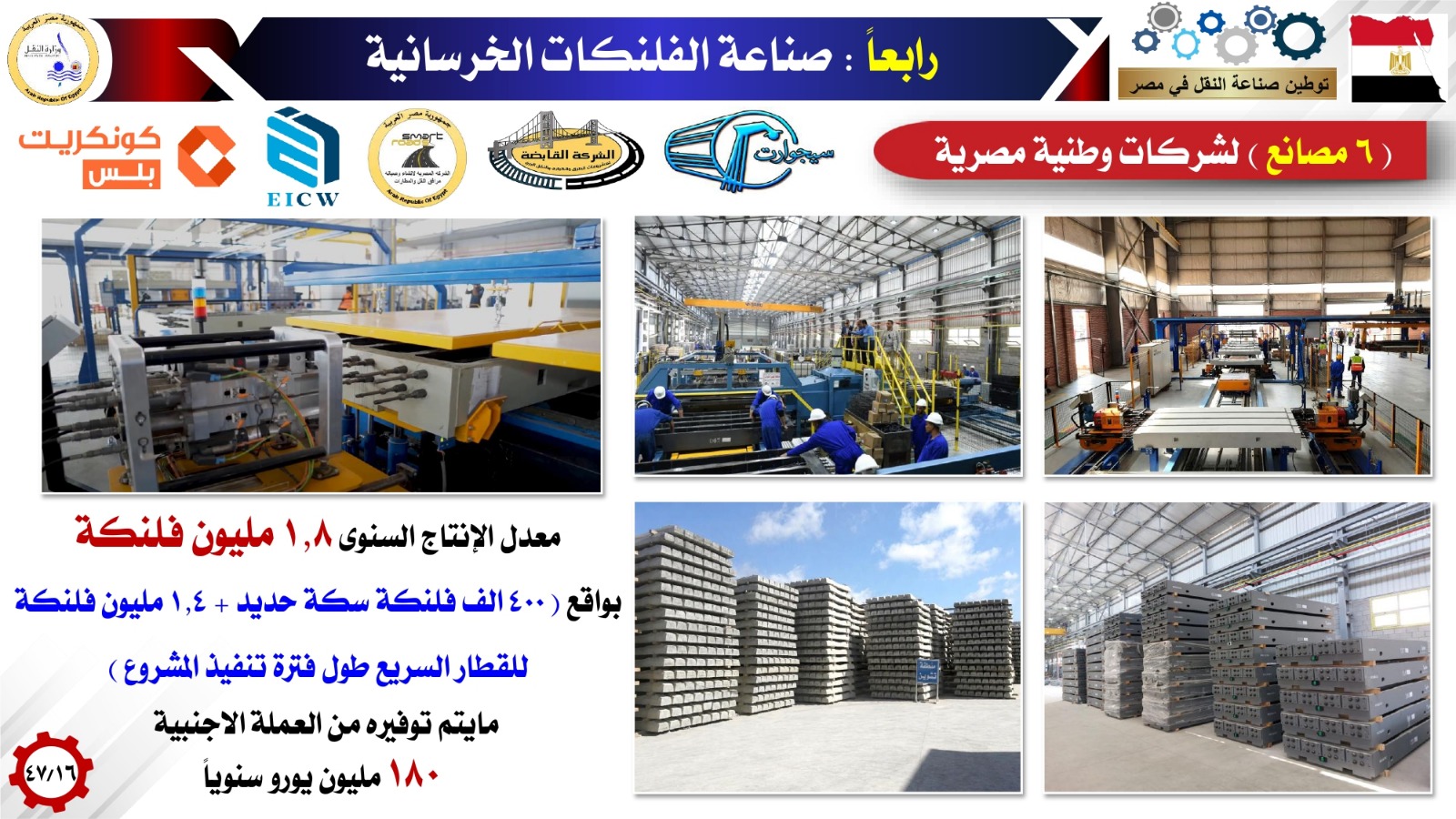 و أشار الوزير إلى توطين صناعة الفلنكات الخرسانية من خلال 6 مصانع لشركات وطنية مصرية بمعدل إنتاج سنوي 1.8 مليون فلنكة، بواقع (400 ألف فلنكة سكة حديد + 1.4 مليون فلنكة للقطار السريع طول فترة تنفيذ المشروع)، وهو ما يساهم في توفير 180 مليون يورو سنوياً من العملة الأجنبية.