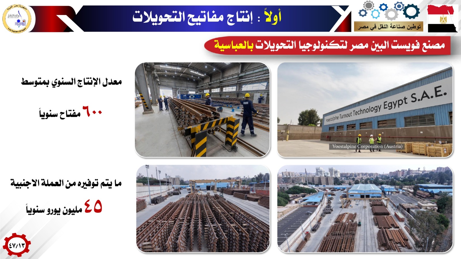 كما استعرض الوزير أهم ما تم تنفيذه من خطة التوطين حتى الآن، مشيرا إلى توطين صناعات السكك الحديدية ومترو الأنفاق والجر الكهربائى، حيث أشار إلى إنتاج مفاتيح التحويلات بمصنع فويست ألبين مصر لتكنولوجيا التحويلات بالعباسية بمعدل إنتاج سنوي 600 مفتاح، وهو ما يساهم في توفير 45 مليون يورو سنوياً من العملة الأجنبية، وإنتاج المكونات الداخلية لقطارات السكك الحديدية بمصنع كولواى مصر بورش كوم أبو راضي بمعدل 100 عربة سنوياً، وهو ما يساهم في توفير 40 مليون يورو سنوياً من العملة الأجنبية إلى جانب صناعة القضبان بمصنع السويس للصلب بمعدل إنتاج 800 ألف طن سنوياً منها 135 ألف طن سنوياً قضبان سكك حديدية ، بواقع (30 ألف طن للسكة الحديد + 100 ألف طن للقطار السريع خلال مرحلة الإنشاء + 5000 طن لمشروعات مترو الأنفاق)، وهو مايساهم في توفير 115 مليون يورو سنوياً من العملة الأجنبية.