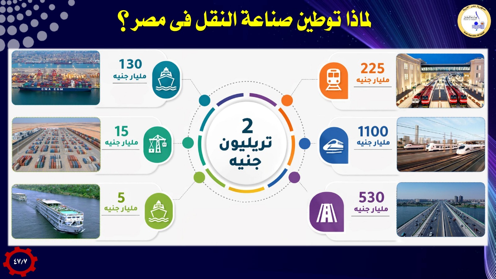 كما استعرض الوزير توطين صناعات النقل البحرى والنهرى، حيث يتم تصنيع الوحدات البحرية المستخدمة فى خدمات القطر والإرشاد للسفن (قاطرات بقوة شد 60 / 70 / 90 طن – لنشات) ومعدات الحد من تلوث البيئة البحرية (وحدات مكافحة التلوث – كاشطات زيوت – ٠٠٠٠٠٠٠٠)، بالإضافة الى تصنيع سفن نقل بطول من (٧٠ إلى ١٠٠ ) متر وحمولة من (٢٠٠٠ الى ١٠ آلاف )طن وتصنيع هذه الوحدات بالترسانات الوطنية المصرية، بالشراكة مع هيئة قناة السويس وجهاز الصناعات والخدمات البحرية للقوات المسلحة وترسانات القطاع الخاص.