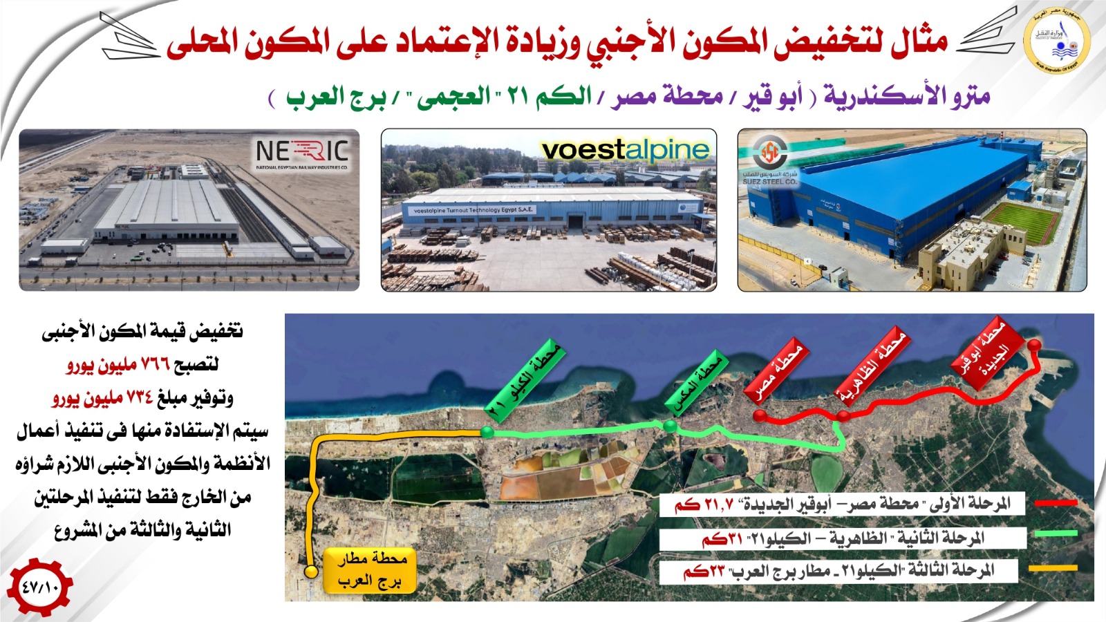واستعرض الوزير مثالاً لتخفيض المكون الأجنبي وزيادة الاعتماد على المكون المحلي من خلال مشروع مترو الإسكندرية (أبو قير / محطة مصر / الكيلو 21 “العجمي” / برج العرب)، حيث بلغت تكلفة المرحلة الأولى من المشروع (أبو قير – محطة مصر) مبلغ 1.7 مليار يورو، منها مكون أجنبي 1.5 مليار يورو لتنفيذ أعمال الأنظمة والسكة والوحدات المتحركة، و الجارى تنفيذ أعماله الإنشائية حالياً، ونتيجة لإنشاء مصنع السويس للصلب لإنتاج القضبان، ومصنع فويست ألبين لإنتاج مفاتيح التحويلات، ومصنع نيرك لإنتاج الوحدات المتحركة، تم تخفيض قيمة المكون الأجنبي لتصبح 766 مليون يورو، وتوفير مبلغ 734 مليون يورو، والذى يمثل حوالى 50% من التمويل الخارجى، وسيتم الاستفادة من هذا الوفر فى تنفيذ أعمال الأنظمة والمكون الأجنبى اللازم شراؤه من الخارج فقط لتنفيذ المرحلتين الثانية والثالثة من المشروع.