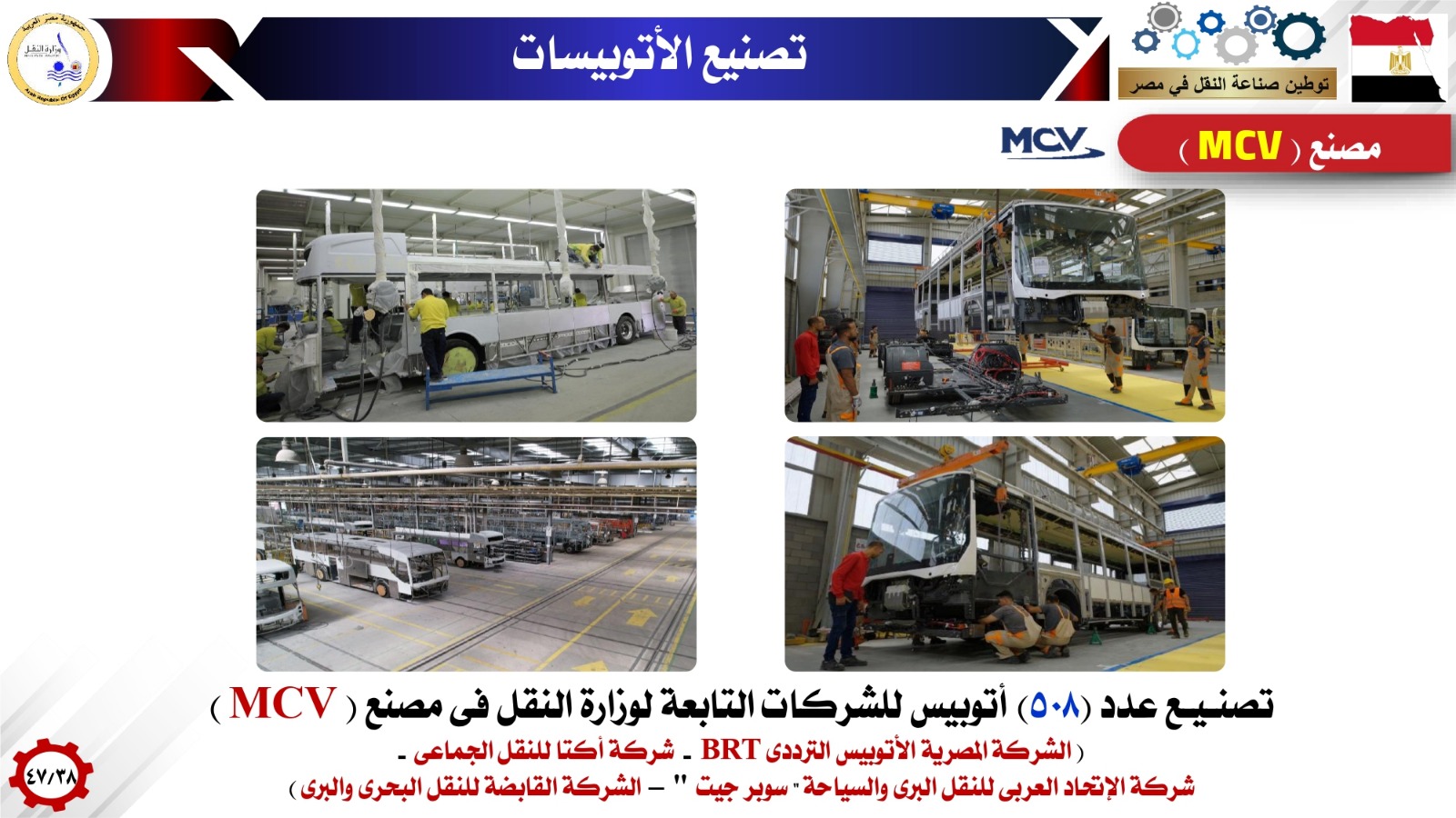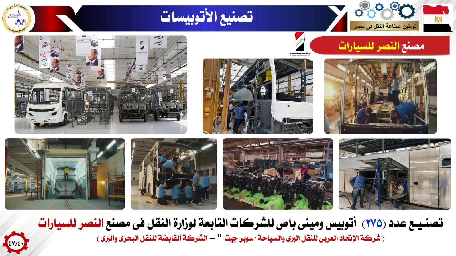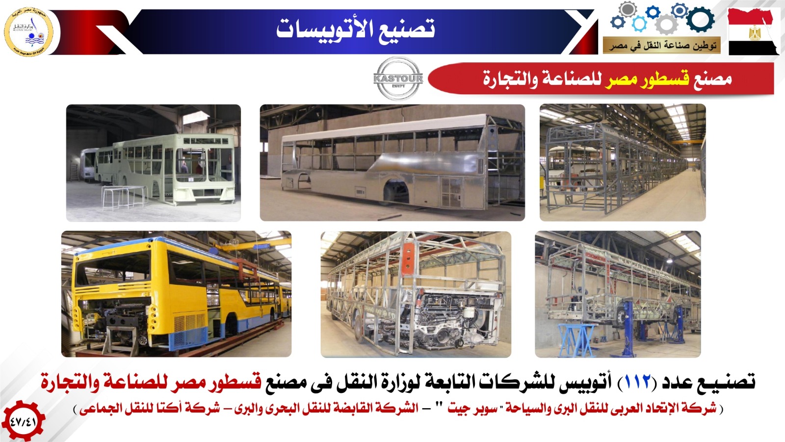 وفيما بتوطين صناعات الأتوبيسات وعربات نقل البضائع أشار الوزير انه تم إنشاء 5 مصانع وطنية عملاقة لإنتاج كافة إحتياجات شركات وزارة النقل والقطاع الخاص من الاتوبيسات والميني باصات وتعاقدت معها شركات وزارة النقل علي إنتاج وتوريد 1500 اتوبيس وميني باص بالإضافة الي 2000 أتوبيس كهربائي جاري الإتفاق علي تصنيعها بالكامل حتي البطارية بناء علي توجيهات فخامة الرئيس عبدالفتاح السيسي رئيس الجمهورية وذلك للنقل العام الداخلي مستعرضا هذه المصانع( MCV - الجيوشي -النصر للسيارات - قسطور مصر للصناعة والتجارة - GB BUS كما استعرض نماذج لتصنيع الأتوبيسات في مصر والتي تم استخدامها في اتوبيسات BRT واتوبيسات شركة اكتا واتوبيسات شركات (شرق الدلتا -غرب ووسط الدلتا-الصعيد ) للنقل والسياحة واتوبيسات شركة السوبرجيت والتي منها اتوبيسات بدور واحد وأخرى اتوبيسات دورين وكذلك تم استعراض نماذج لتصنيع الميني باصات في مصر لدعم منظومة النقل داخل المدن ومنظومة النقل المتجهة إلى العاصمة الجديدة وربط المدن الجديدة بوسائل الجر الكهربائي الحديثة مثل القطار الكهربائى الخفيف ومونوريل شرق النيل ) وكذلك استعرض الوزير تصنيع مقطورات نقل البضائع في مصر من خلال مصنع اباظة مشيرا الى التعاقدات التي تمت لصالح شركة النيل لنقل البضائع التابعة لوزارة النقل بالإضافة إلى تصنيع رأس جرار /مقطورات نقل البضائع في مصر من خلال مصنع MCV مشيرا الى التعاقدات التي تمت لصالح شركة النيل لنقل البضائع التابعة لوزارة النقل.