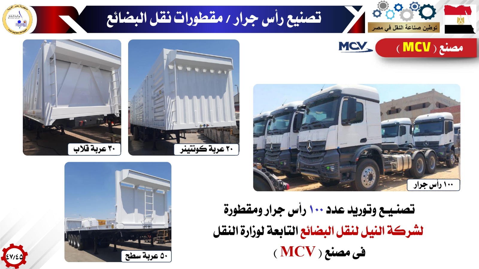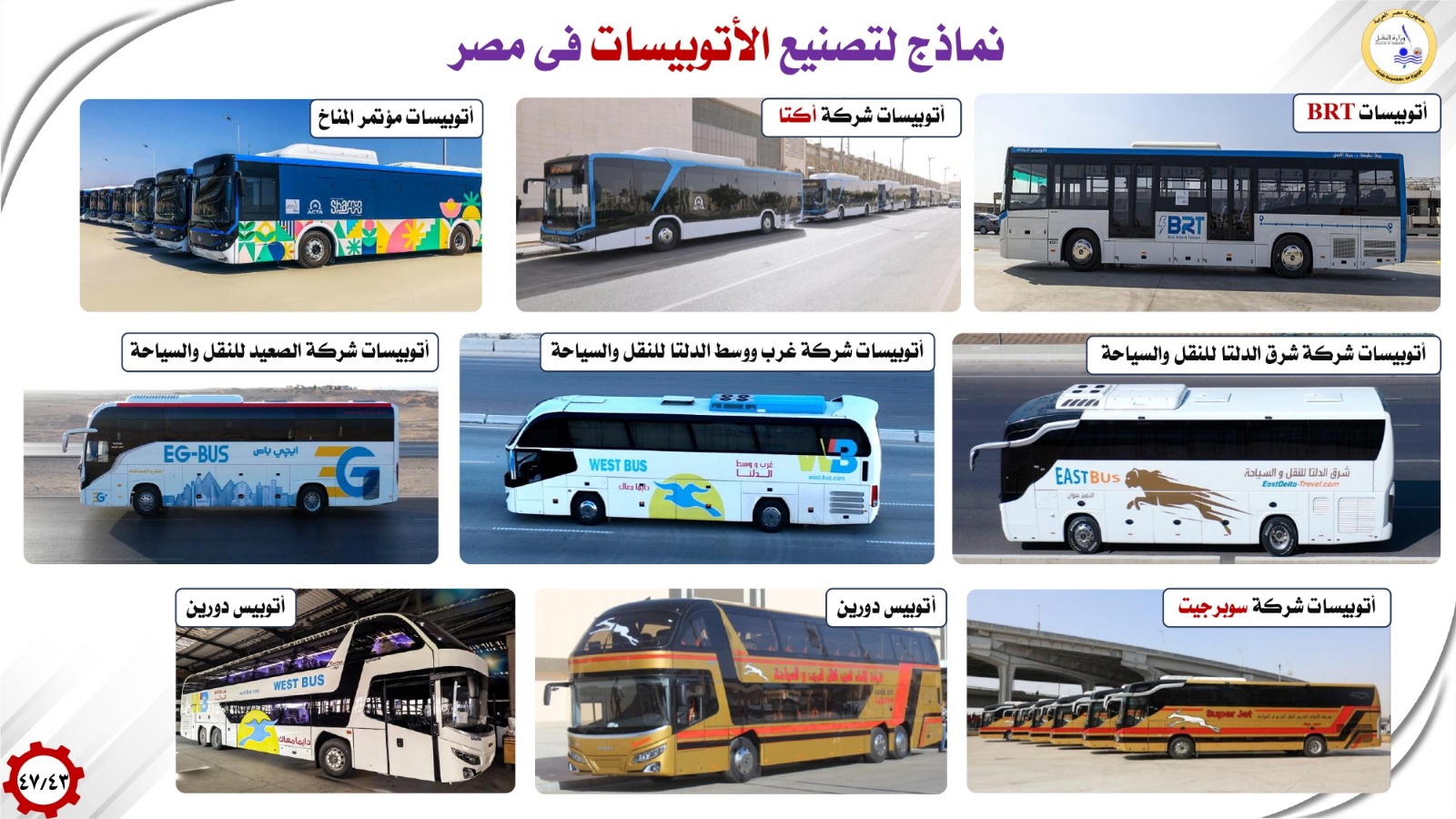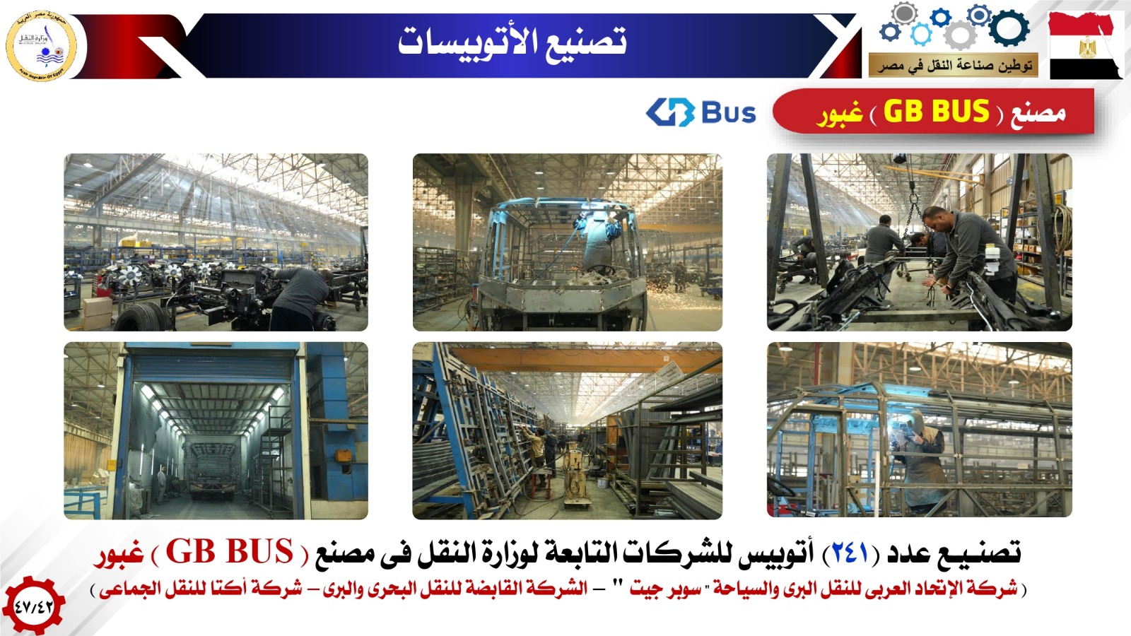 وفيما بتوطين صناعات الأتوبيسات وعربات نقل البضائع أشار الوزير انه تم إنشاء 5 مصانع وطنية عملاقة لإنتاج كافة إحتياجات شركات وزارة النقل والقطاع الخاص من الاتوبيسات والميني باصات وتعاقدت معها شركات وزارة النقل علي إنتاج وتوريد 1500 اتوبيس وميني باص بالإضافة الي 2000 أتوبيس كهربائي جاري الإتفاق علي تصنيعها بالكامل حتي البطارية بناء علي توجيهات فخامة الرئيس عبدالفتاح السيسي رئيس الجمهورية وذلك للنقل العام الداخلي مستعرضا هذه المصانع( MCV - الجيوشي -النصر للسيارات - قسطور مصر للصناعة والتجارة - GB BUS كما استعرض نماذج لتصنيع الأتوبيسات في مصر والتي تم استخدامها في اتوبيسات BRT واتوبيسات شركة اكتا واتوبيسات شركات (شرق الدلتا -غرب ووسط الدلتا-الصعيد ) للنقل والسياحة واتوبيسات شركة السوبرجيت والتي منها اتوبيسات بدور واحد وأخرى اتوبيسات دورين وكذلك تم استعراض نماذج لتصنيع الميني باصات في مصر لدعم منظومة النقل داخل المدن ومنظومة النقل المتجهة إلى العاصمة الجديدة وربط المدن الجديدة بوسائل الجر الكهربائي الحديثة مثل القطار الكهربائى الخفيف ومونوريل شرق النيل ) وكذلك استعرض الوزير تصنيع مقطورات نقل البضائع في مصر من خلال مصنع اباظة مشيرا الى التعاقدات التي تمت لصالح شركة النيل لنقل البضائع التابعة لوزارة النقل بالإضافة إلى تصنيع رأس جرار /مقطورات نقل البضائع في مصر من خلال مصنع MCV مشيرا الى التعاقدات التي تمت لصالح شركة النيل لنقل البضائع التابعة لوزارة النقل.