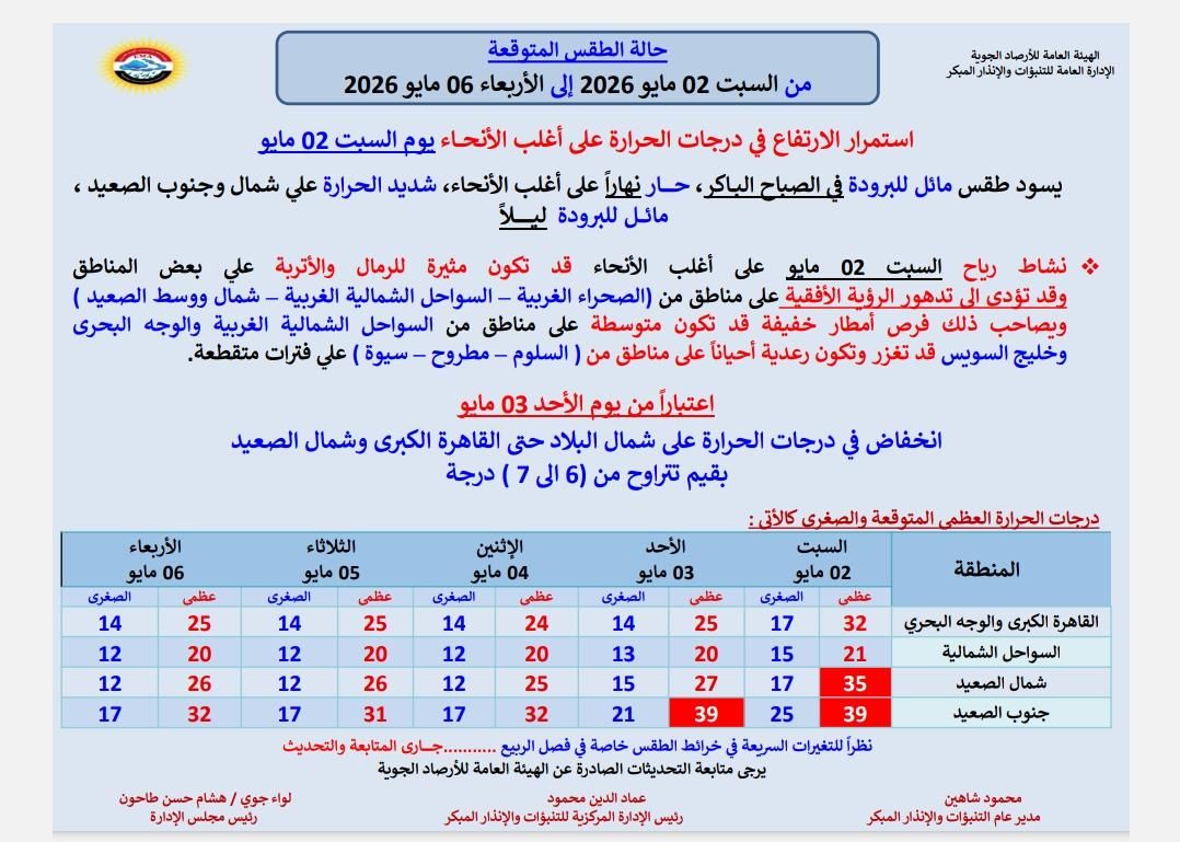 حذرت الهيئة العامة للأرصاد الجوية من أن يومي الجمعة والسبت سيشهدان ذروة الارتفاع في درجات الحرارة على مستوى الجمهورية، في موجة حارة تضرب معظم المحافظات، حيث من المتوقع أن تصل درجات الحرارة العظمى في القاهرة الكبرى إلى 32 درجة مئوية، بينما تسجل محافظات جنوب الصعيد ما بين 37 و39 درجة مئوية، لتكون الأعلى منذ بداية الربيع.