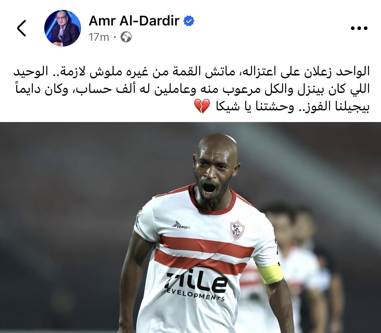 عبّر الناقد الرياضي عمرو الدرديري عن حزنه لاعتزال نجم نادي الزمالك محمود عبد الرازق شيكابالا، وذلك عبر حسابه على فيسبوك، قبل مواجهة القمة المرتقبة.
