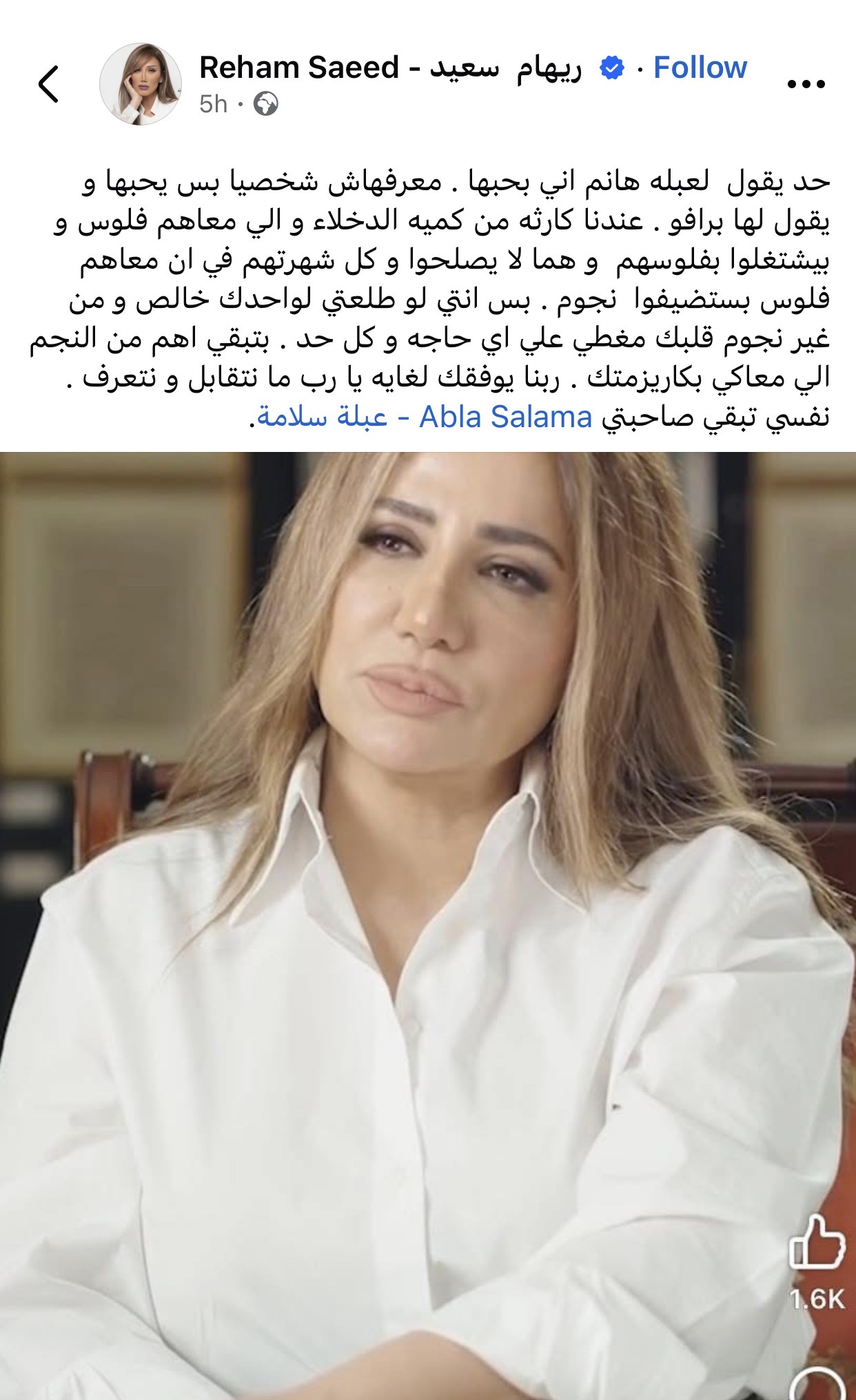 أعربت الإعلامية ريهام سعيد عن إعجابها بالإعلامية عبلة سلامة، وذلك من خلال منشور عبر حسابها على فيسبوك، معبرة عن حبها لأسلوبها الإعلامي وتقدّر حضورها، مشيدة بالكاريزما التي تمتلكها.