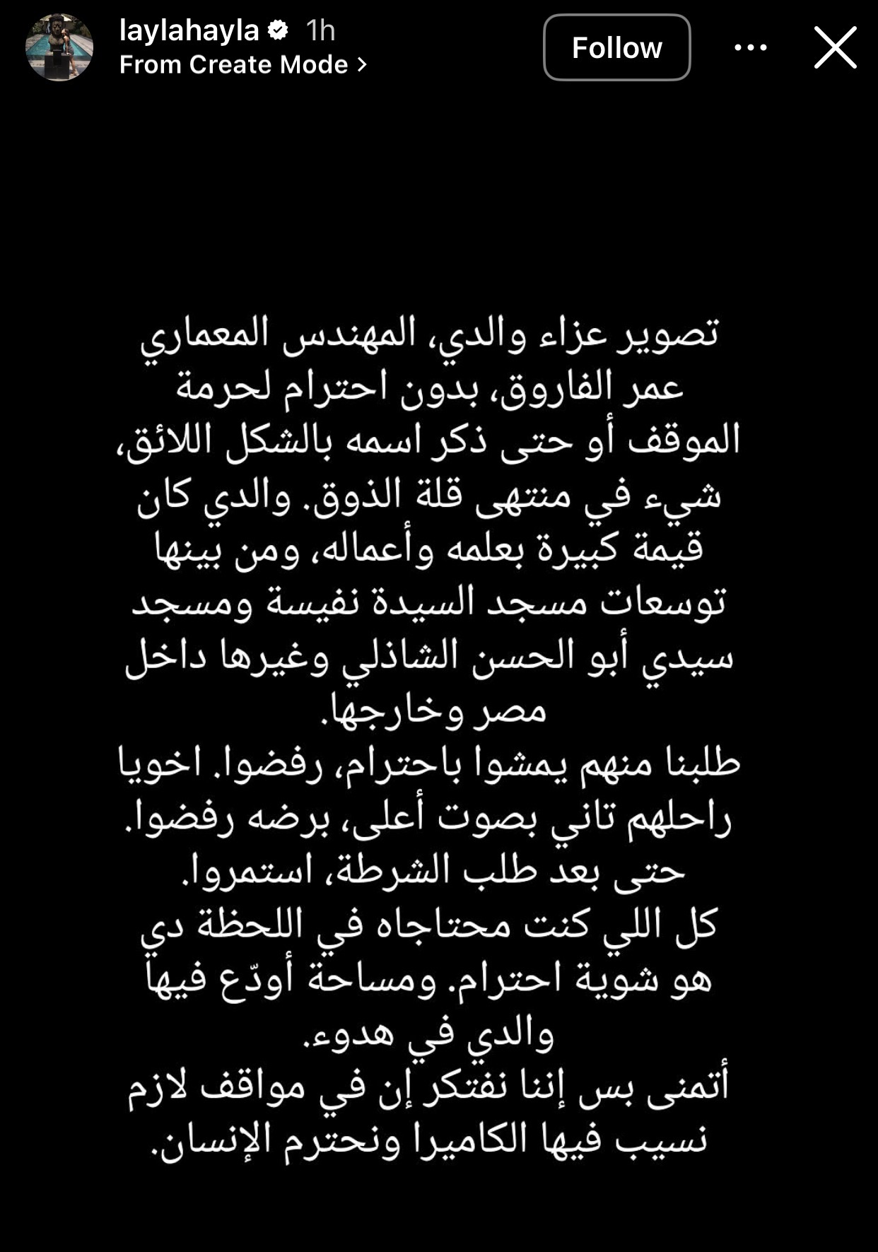 ونشرت ليلى الفاروق عبر خاصية “ستوري” على حسابها بموقع إنستجرام، أن ما حدث خلال عزاء والدها، المهندس المعماري عمر الفاروق، يُعد تصرفًا غير لائق، خاصة مع عدم احترام طبيعة المناسبة أو حتى ذكر اسم الراحل بشكل يليق بتاريخه.