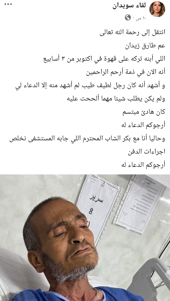 وكتبت لقاء سويدان عبر حسابها على موقع «فيسبوك»:“انتقل إلى رحمة الله تعالى عم طارق زيدان، الذي تركه ابنه على قهوة في أكتوبر منذ نحو ثلاثة أسابيع، وهو الآن في ذمة أرحم الراحمين أشهد أنه كان رجلاً لطيفًا طيبًا، لم أشهد منه إلا الدعاء لي، ولم يكن يطلب شيئًا مهما ألححت عليه. كان هادئًا ومبتسمًا، أرجوكم الدعاء له بالرحمة والمغفرة”.