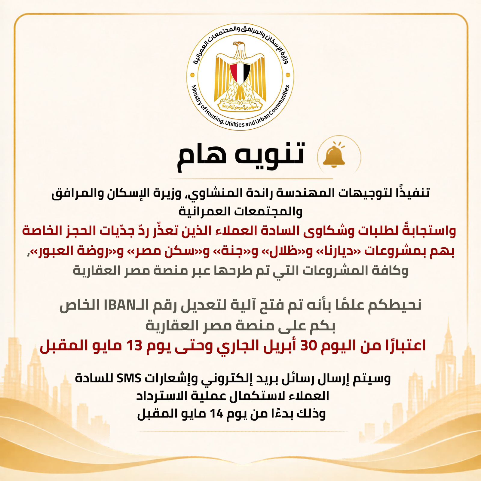 أعلنت وزارة الإسكان والمرافق والمجتمعات العمرانية، عن فتح آلية لتعديل رقم الـIBAN الخاص بعمليات رد جدّيات الحجز الخاصة بهم بمشروعات «ديارنا» و«ظلال» و«جنة» و«سكن مصر» و«روضة العبور»، وكافة المشروعات التي تم طرحها عبر منصة مصر العقارية.