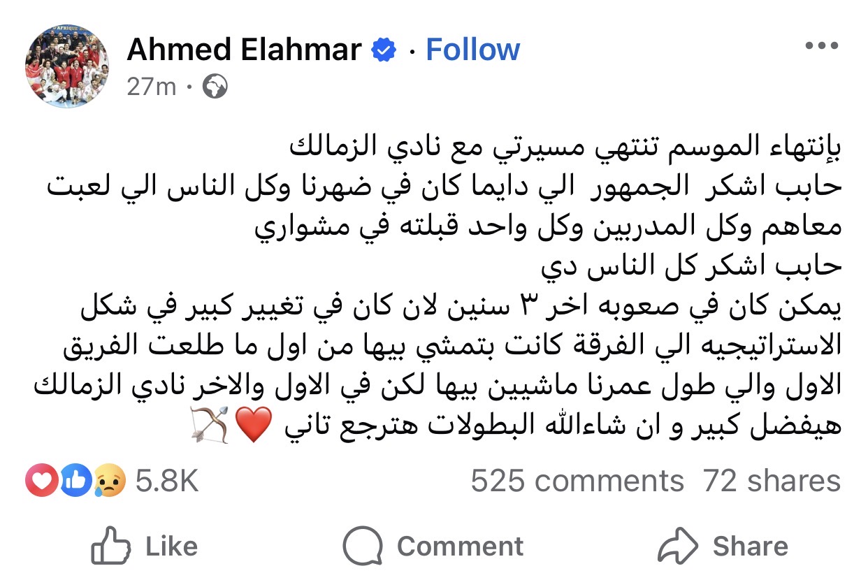 أعلن أحمد الأحمر لاعب نادي الزمالك لكرة اليد، انتهاء مشواره مع النادي بنهاية الموسم الجاري، وذلك عبر حسابه على موقع فيسبوك.