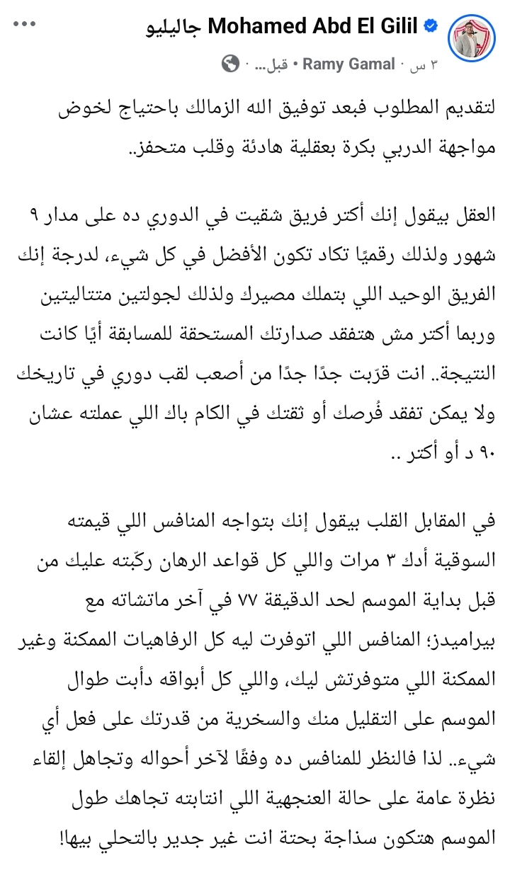 وكتب عبد الجليل عبر حسابه على "فيسبوك"، أن الزمالك قدم موسمًا استثنائيًا على مدار 9 أشهر، جعله الأفضل رقميًا في العديد من الجوانب، موضحًا أن الفريق لا يزال يملك مصيره بيده، ولن يفقد صدارة الدوري في الجولتين المقبلتين مهما كانت النتائج.