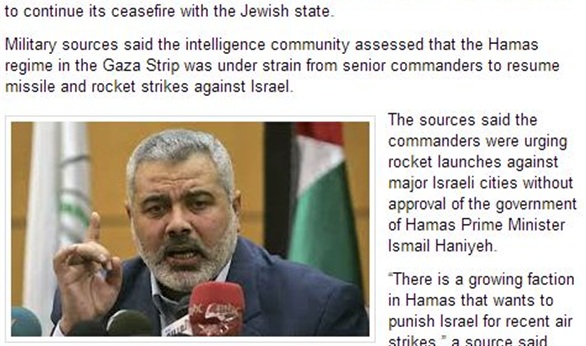 كشفت صحيفة وورلد تريبيون الأمريكية عن وجود تمرد وانشقاقات داخل حركة حماس التي تحكم قطاع غزة، حيث يرفض قادة الجناح العسكري تعليمات اسماعيل هنية وأعضاء المكتب السياسي بوقف إطلاق الصواريخ على إسرائيل.
