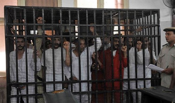 المتهمون فى "وادى النطرون " يهتفون "ثوار أحرار هنكمل المشوار" ويرفعون شارة رابعة