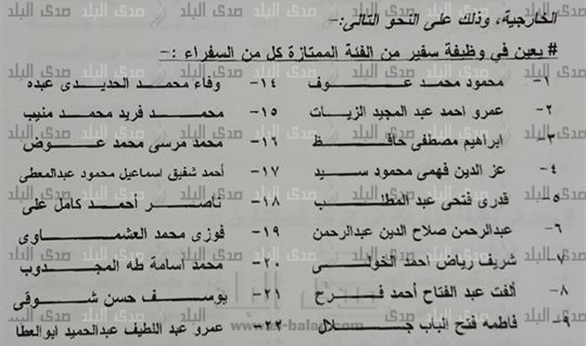 كما صدر قراراً بتعيين الوزراء المفوضين في وظيفة سفير وهم: هويدا عصام عبدالرحمن وخالد فتحي على يوسف وخالد إبراهيم السعيد عمارة وياسر مصطفى كمال عثمان وأحمد عبد العزيز عزت وبهاء الدين بهجت إبراهيم دسوقي ومؤيد فتح الله محمد الضلعي وعبير عمر محمود سليمان ومحمد عبدالستار محمد البدري وعزالدين شكري محمود وعادل حسن محمد الألفي وأشرف إبراهيم أحمد إبراهيم وأماني محمود محمد فهمي ومحمود عاصم محمود المغربي وغادة أبوالفتح على الغنام وياسر محمود محمود هاشم ومحمود على طلعت محمود ويوسف حمدي محمد ناصف وحازم السيد بدوي الطاهري وندى مصطفة فتحي دراز وهشام نهاد سيف الدين وفؤاد أحمد فؤاد حسني ويوسف ضياء الدين مكاوي وهالة سمير دسوقي البشلاوي وسها سمير ناشد جندي وعلى مرسي عباس الحلواني ومنال السيد يحيى الشناوي وحاتم السيد محمد تاج الدين ووائل السيد محمد جاد وطارق عبد الحميد نور الدين ومحمود فاروق يوسف عامر وبدر أحمد عبدالعاطي وعاصم محمد حنفي محمود.