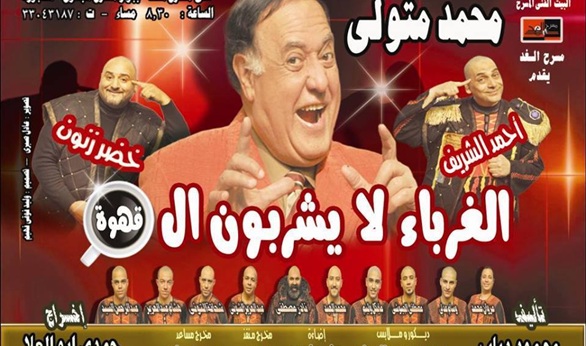 و"الغرباء لا يشربون القهوة" بطولة محمد متولي، أحمد الشريف ، حسام عادل ، وعدد من الوجوه الشابة أعضاء جماعة مسرح الغد أبرزهم نادر مصطفى ، أسلام رياض ، هشام عبد العزيز ، خالد دياب ، ديكور صبحي عبد الجواد ، إضاءة عز حلمي، تأليف الراحل محمود دياب ، و اخراج حمدى أبو العلا.