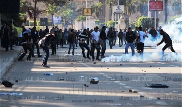 وتطلق قوات الامن قنابل الغاز المسيل للدموع على الطلبة المتواجدين بمحيط ميدان نهضة مصر، وذلك لتفريقهم والسيطرة على اعمال العنف التي يشهدها محيط جامعة القاهرة.