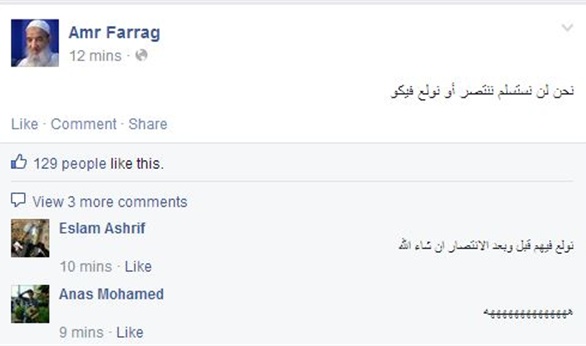 وقال فراج على صفحته بالفيس بوك : "نحن لن نستسلم وسننتصر أو نولع فيكم".
