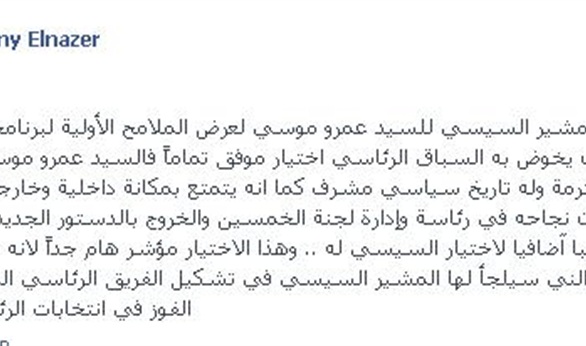 وأضاف الناظر فى تدوينه له على صفحته الشخصية بموقع التواصل الاجتماعى "فيس بوك": يتمتع عمروموسى بشخصية وطنية محترمة وله تاريخ سياسي مشرف ، كما أنه يتمتع بمكانة داخلية وخارجية قوية وفي اعتقادي أن نجاحه في رئاسة وإدارة لجنة الخمسين والخروج بالدستور الجديد بشكل جيد مثل سببا إضافيا لاختيار السيسي له.