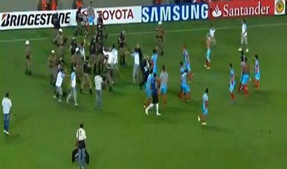 وأظهرت لقطات تلفزيونية خوذات وهراوات الشرطة وهي تتطاير في الهواء ومشجعين يرتدون قمصان وادي الحجارة يدفعون الضباط في المدرجات بعدما أوقدوا المشاعل في وقت سابق.