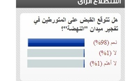 وتوقع 98% من قراء الموقع أن يتم القبض على المتورطين في تفجير ميدان "النهضة، بينما توقع 1% منهم عدم القبض على الجناة، فيما أبدى 1% عدم اهتمامهم.