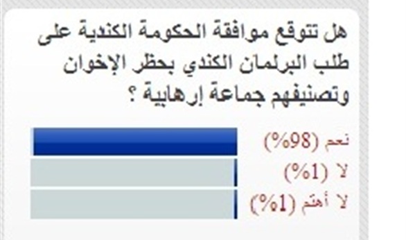 وتوقع 98% من قراء الموقع موافقة الحكومة الكندية على طلب البرلمان الكندي بحظر الإخوان المسلمين وتصنيفهم جماعة إرهابية، بينما توقعوا 1% عدم حظرهم، فيما أبدى 1% عدم اهتمامهم.