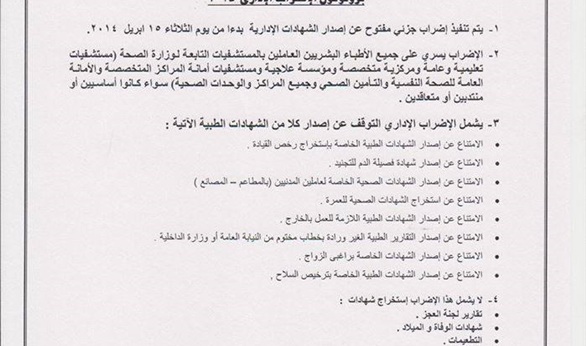 واوضح ان الاضراب الادارى سيسرى على كافة المراكز والمستشفيات الامانة العامة ويمتنع الاطباء عن استخراج شهادات الصحية اللازمة للزواج او العمرة او السفر للخارج.